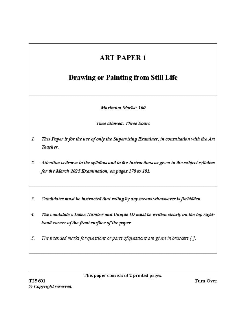 | Subject | Art Paper 1 – Drawing or Painting from Still Life |