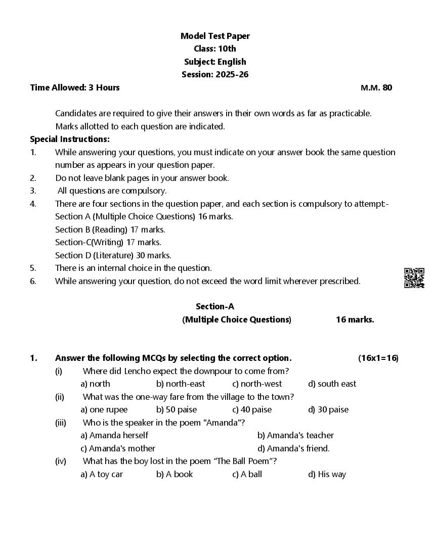 HP Board Class 10 English Model Paper 2026 (PDF) – HPBOSE 10th Sample Paper English