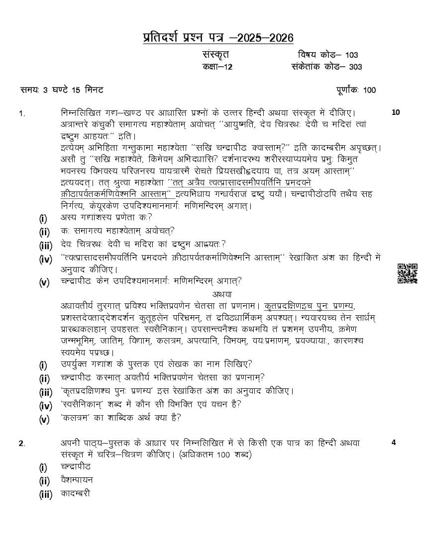 UP Board Class 12th Model Paper 2026 Sanskrit View Download