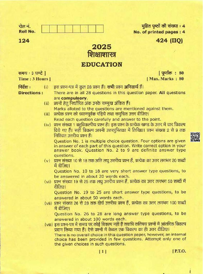 Uttarakhand Board Class 12 Education Question Paper 2025