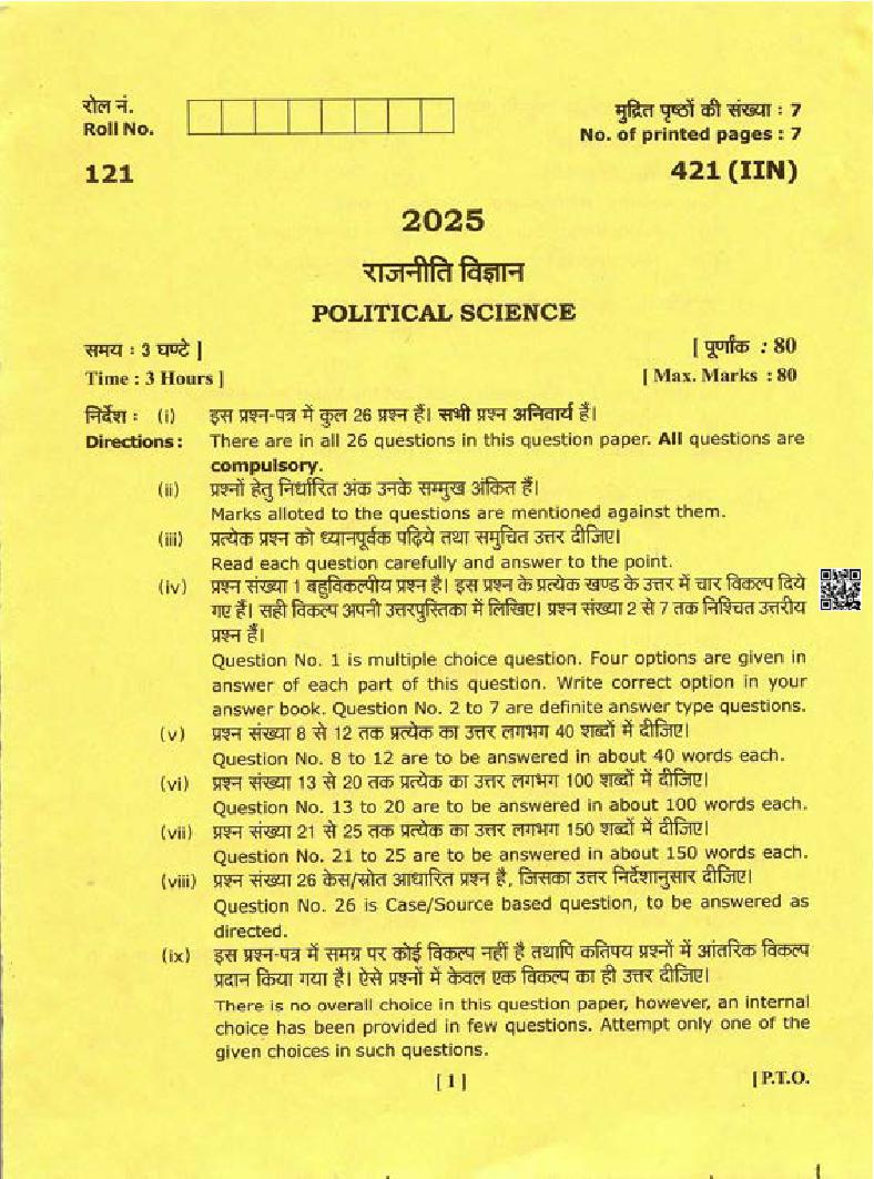 The Uttarakhand Board question paper of class 12 for Political Science is as follows.