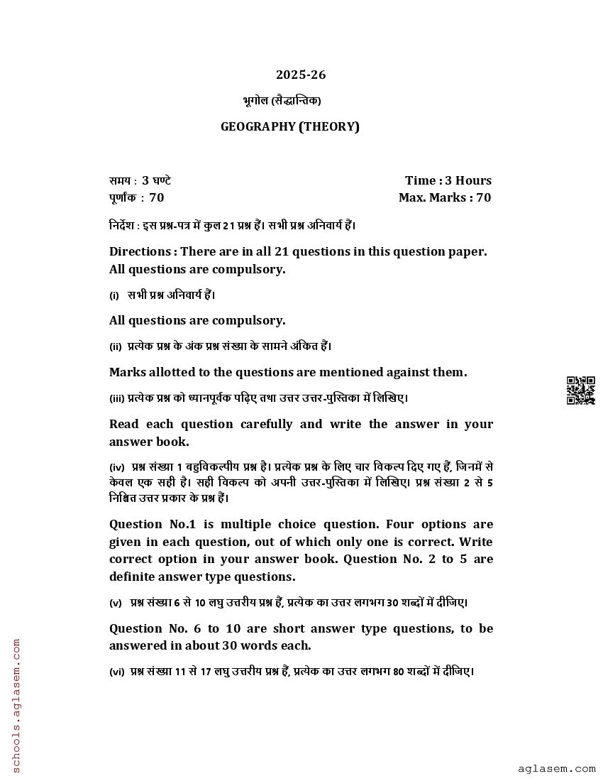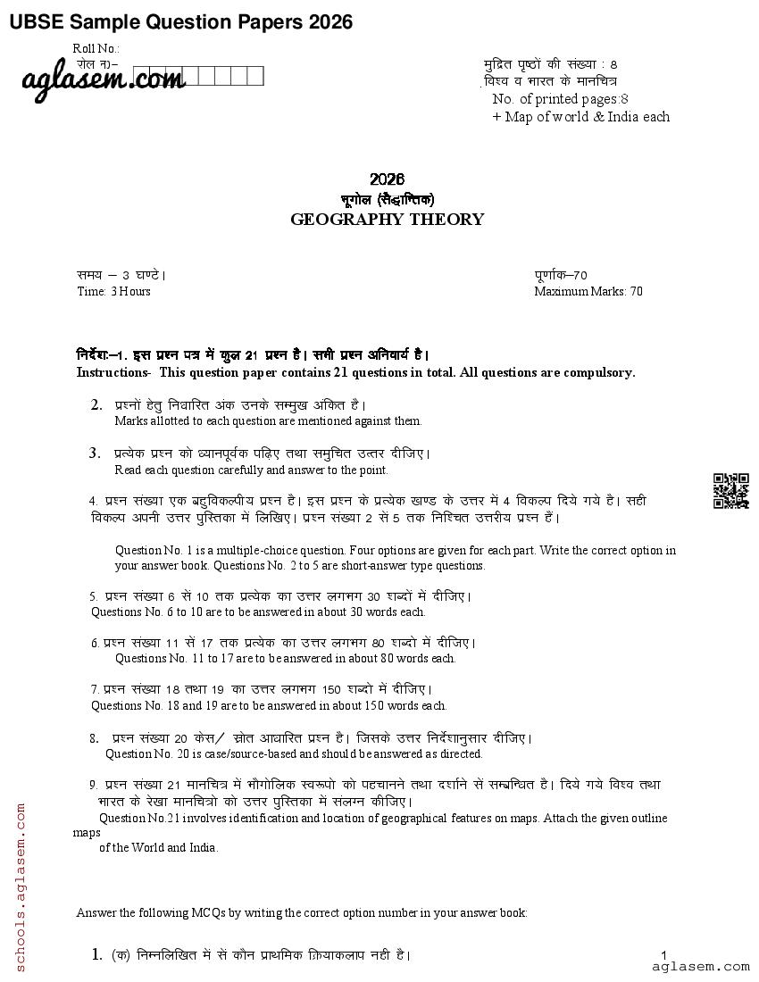 Uttarakhand Board Class 12th Geography Sample Paper 2026 has been released by UBSE. Therefore you can now download the UK Board 12th Model Paper for Geography PDF from here on aglasem. This UK Board class 12 model paper contains sample questions for Geography based on the latest syllabus. Moreover the class 12 sample paper has Geography questions in the same pattern as you will get in UK Board 12th Geography exam that will be held by Uttarakhand Board of School Education. Therefore solving this Geography model question paper increases your chances of getting 100% in UK Board exam.