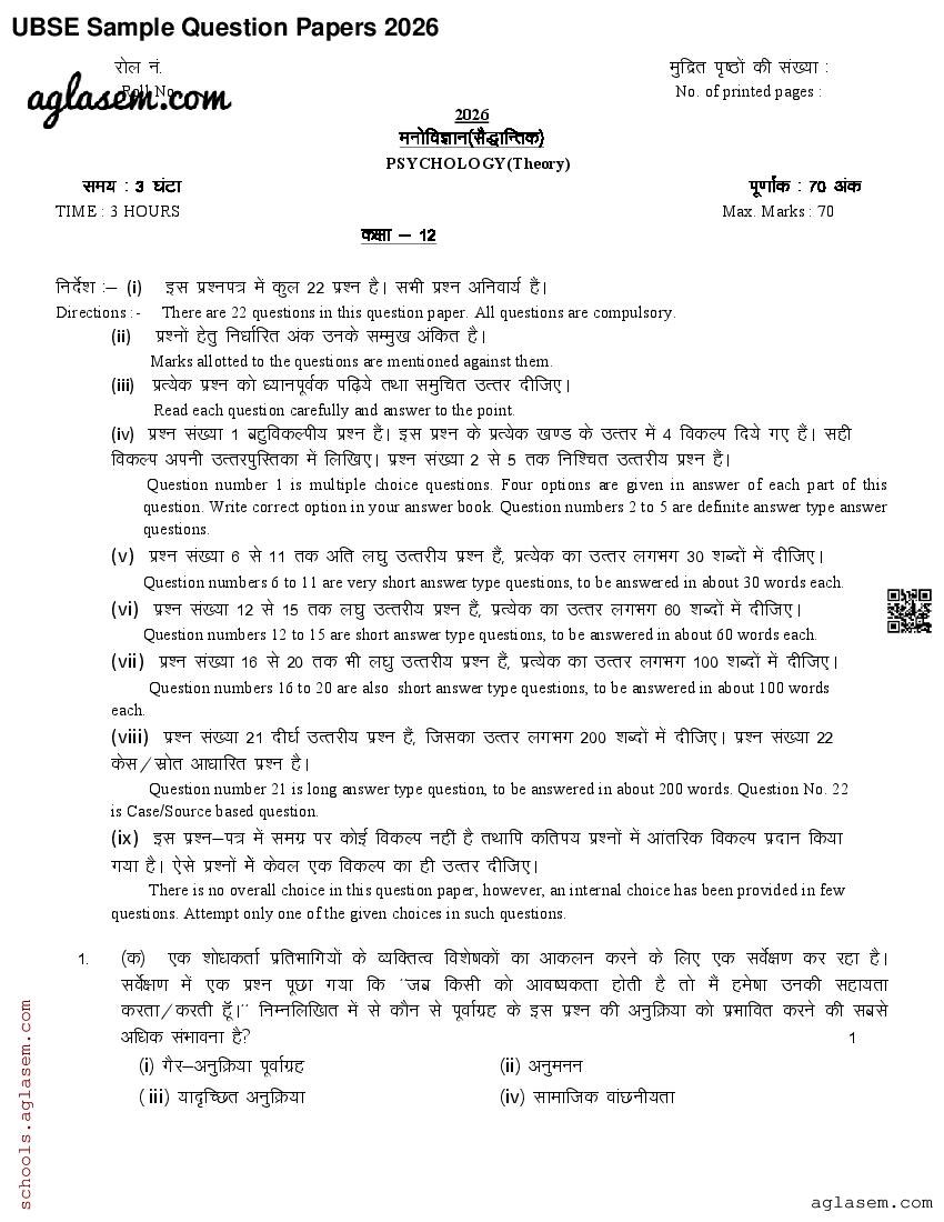 Uttarakhand Board Class 12th Psychology Sample Paper 2026 has been released by UBSE. Therefore you can now download the UK Board 12th Model Paper for Psychology PDF from here on aglasem. This UK Board class 12 model paper contains sample questions for Psychology based on the latest syllabus. Moreover the class 12 sample paper has Psychology questions in the same pattern as you will get in UK Board 12th Psychology exam that will be held by Uttarakhand Board of School Education. Therefore solving this Psychology model question paper increases your chances of getting 100% in UK Board exam.