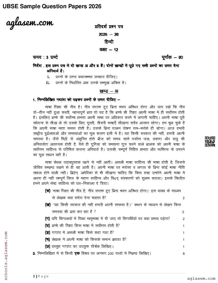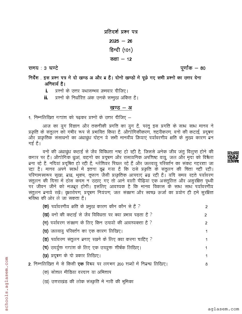 Uttarakhand Board Class 12th Hindi Sample Paper 2026 has been released by UBSE. Therefore you can now download the UK Board 12th Model Paper for Hindi PDF from here on aglasem. This UK Board class 12 model paper contains sample questions for Hindi based on the latest syllabus. Moreover the class 12 sample paper has Hindi questions in the same pattern as you will get in UK Board 12th Hindi exam that will be held by Uttarakhand Board of School Education. Therefore solving this Hindi model question paper increases your chances of getting 100% in UK Board exam.