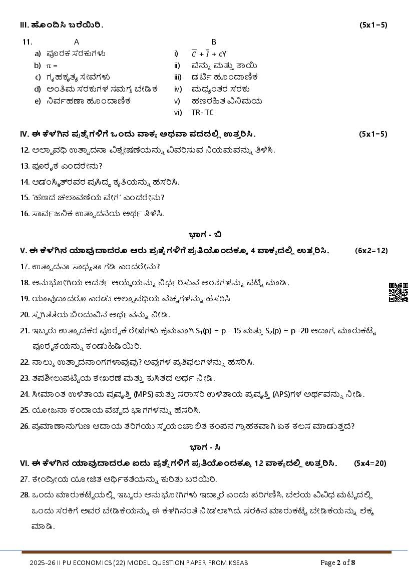 Karnataka 2nd PUC Economics Model Question Paper 2026 has been released by KSEAB, DPUE. You can download the Karnataka Class 12 Economics Sample Question Paper PDF from here on aglasem. This Karnataka 2nd PUC Model Question Paper contains specimen questions for Economics subject based on latest Economics syllabus. Therefore by solving this 2nd PUC Economics model question paper, you can aim to score high marks in the class 12 board exams of Karnataka Board.