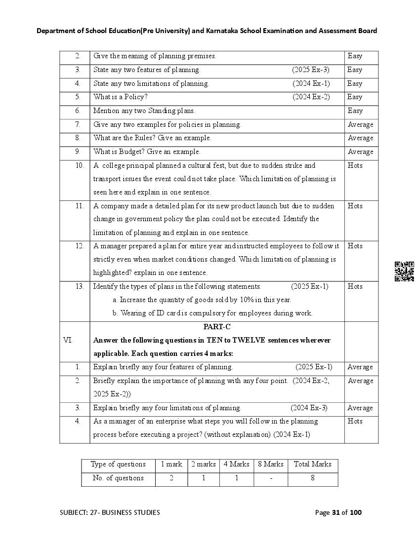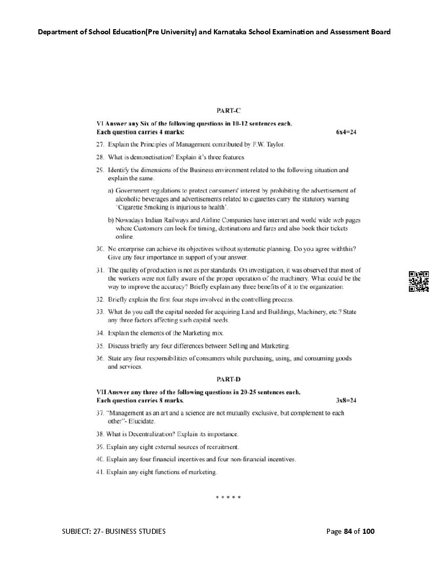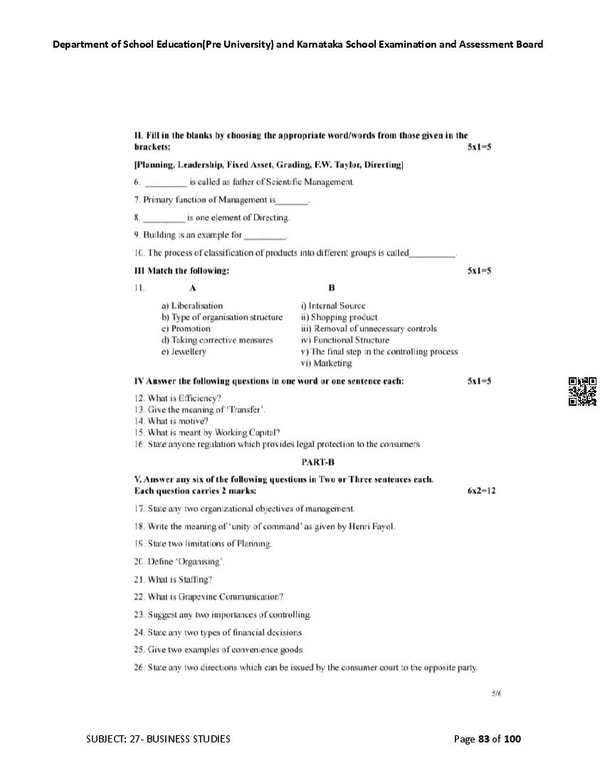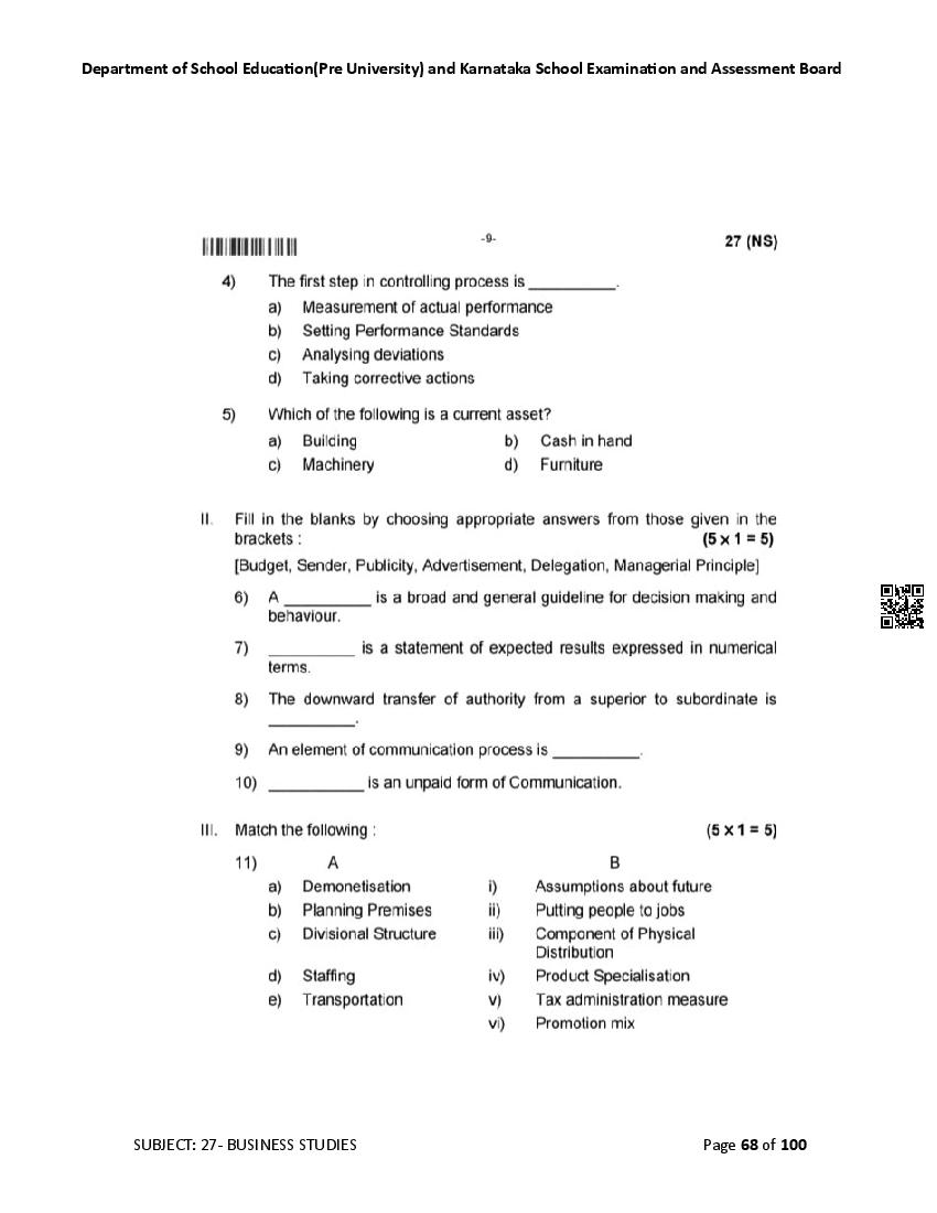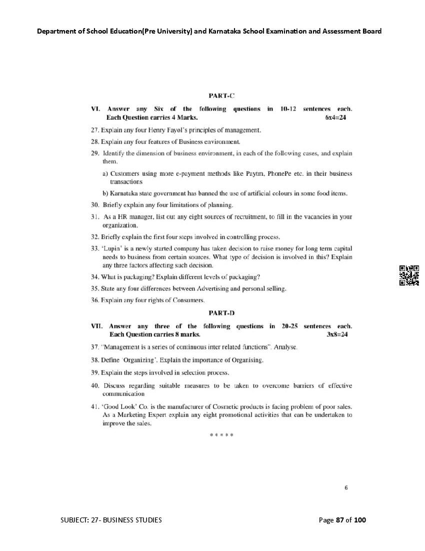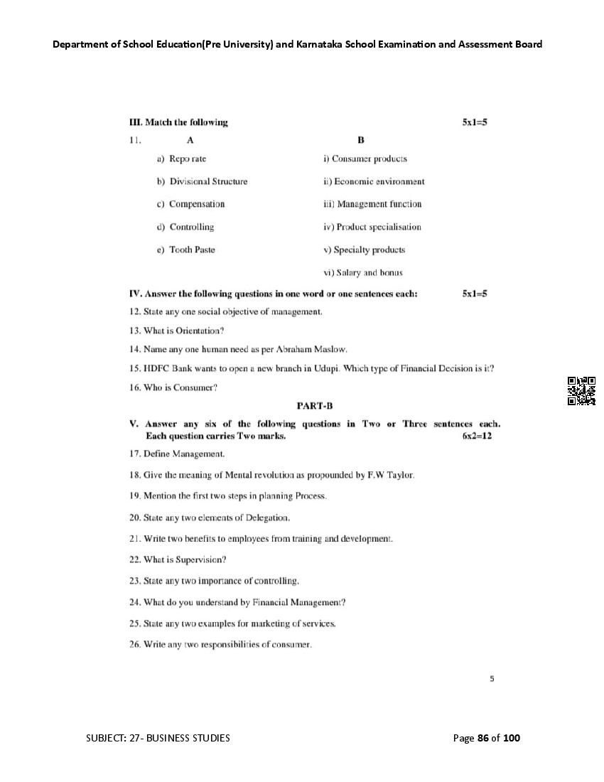 Karnataka 2nd PUC Question Bank for Business Studies View Download