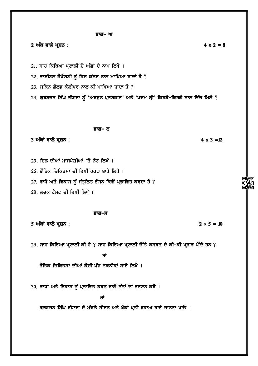 PSEB 10th Physical Education Sample Paper Download Link – Click Here to Download PDF