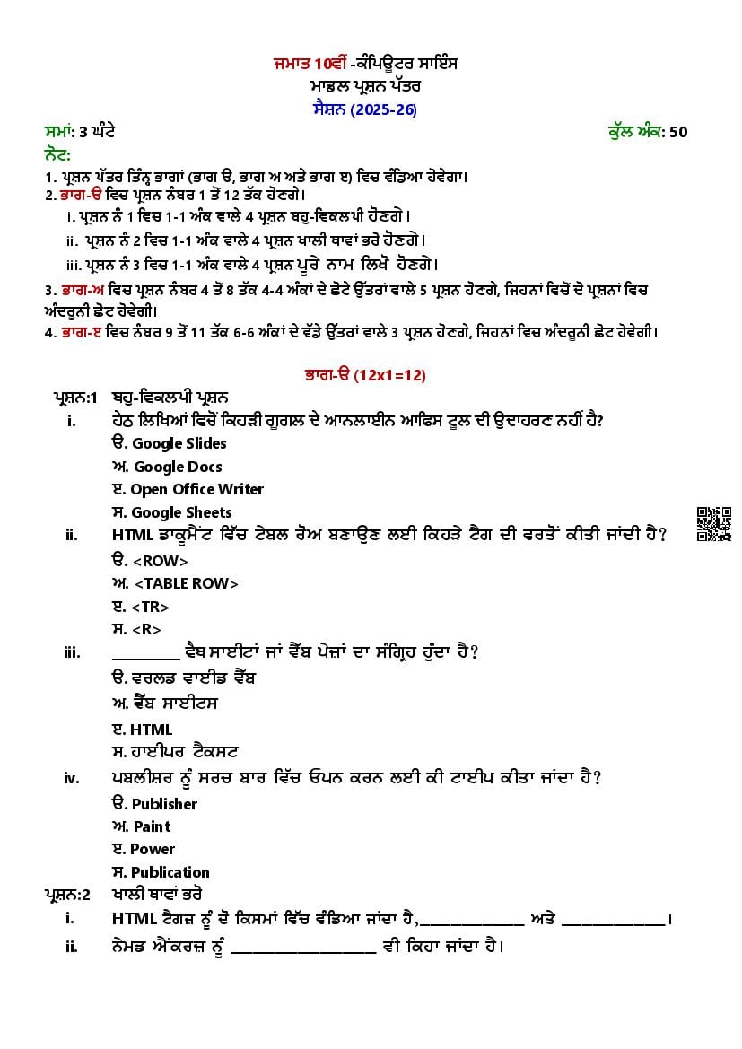 PSEB 10th Sample Paper 2026 Computer Science View Download