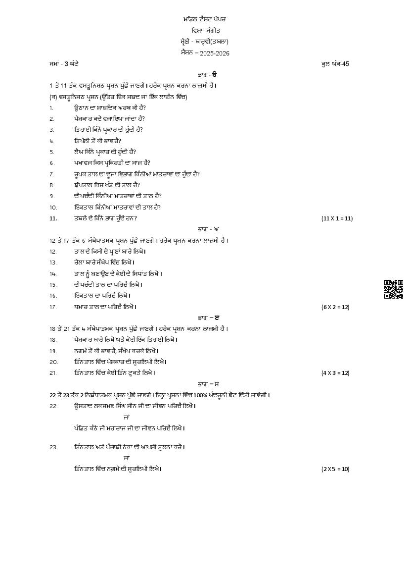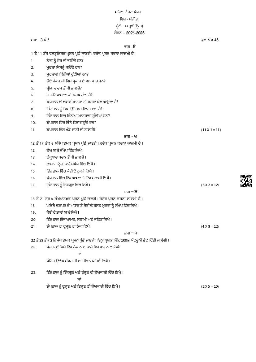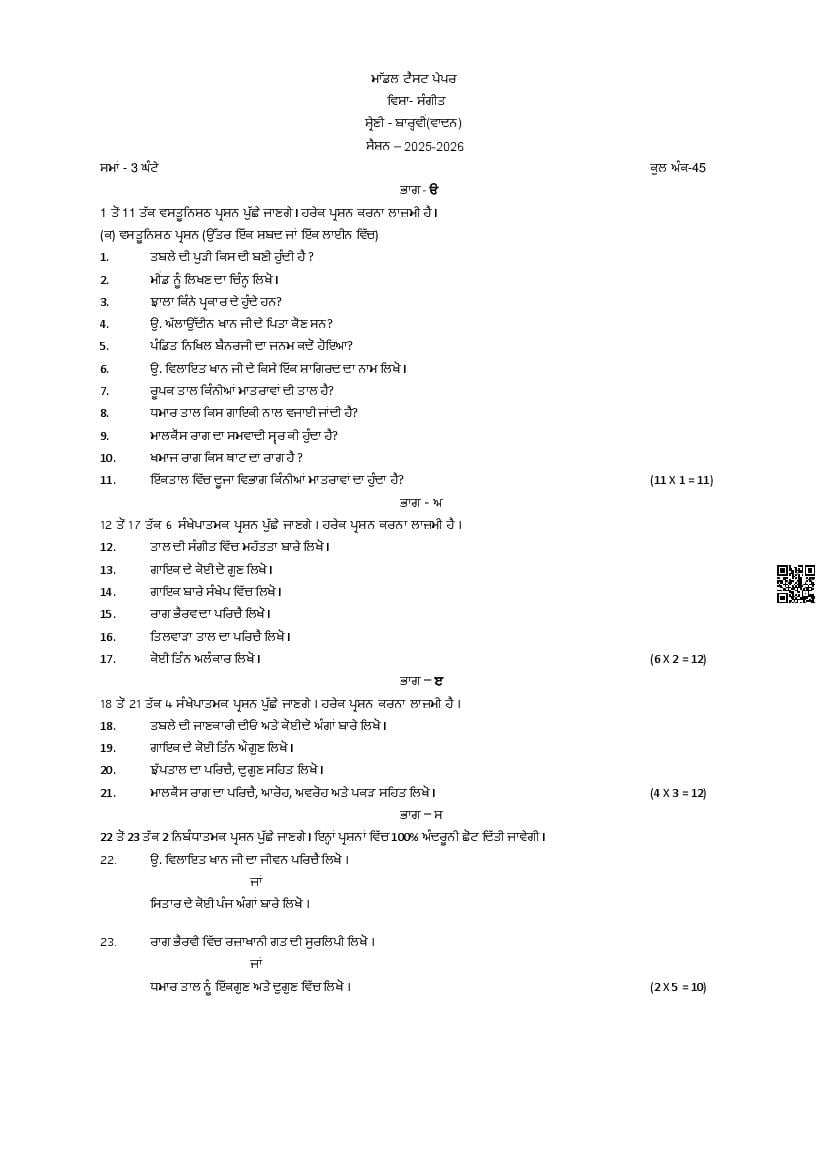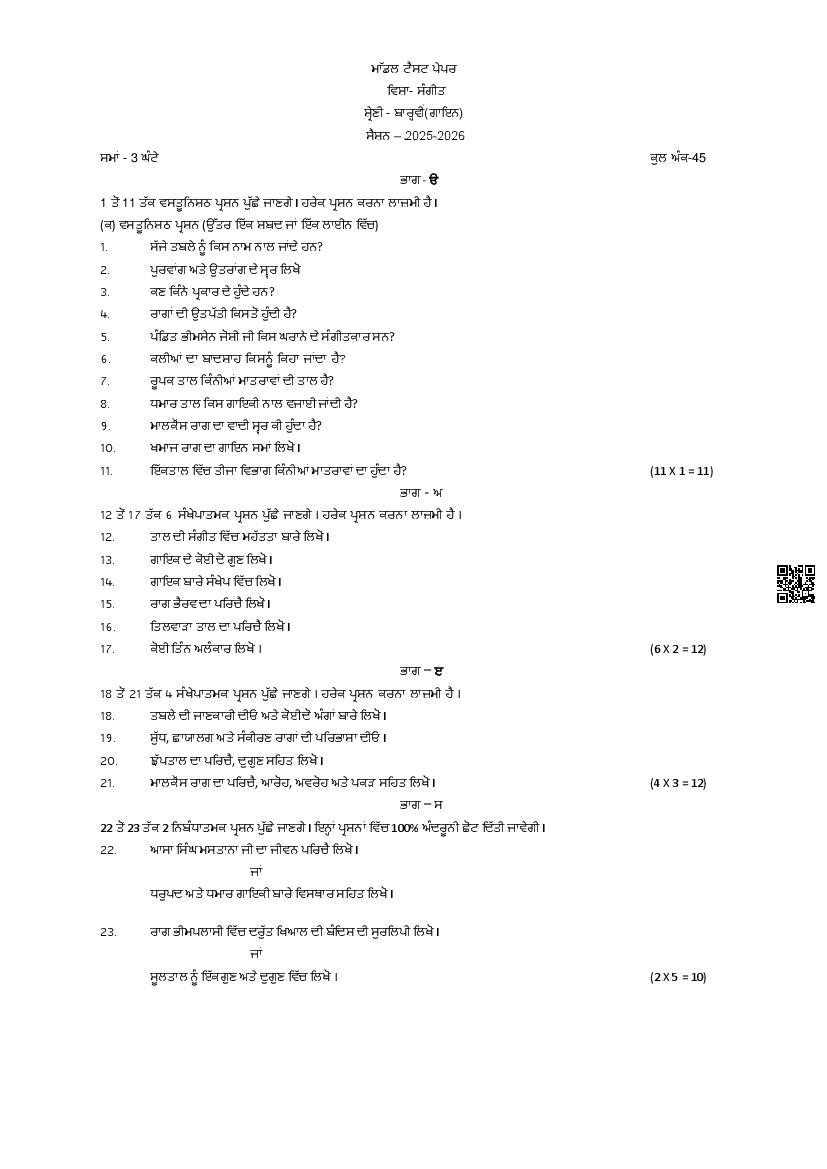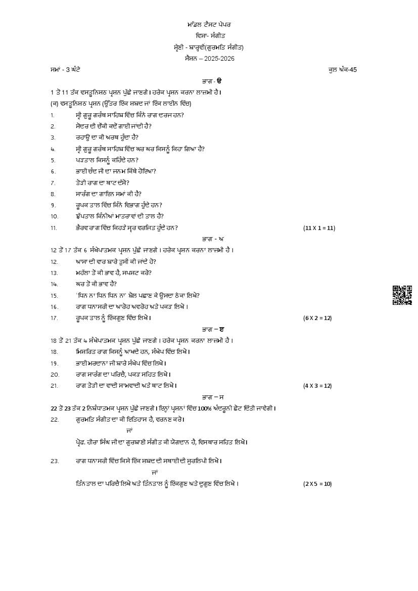 PSEB 12th Sample Paper 2026 Music - Gurmat Sangeet, Dance, Gayan, Tabla, Vadan View Download