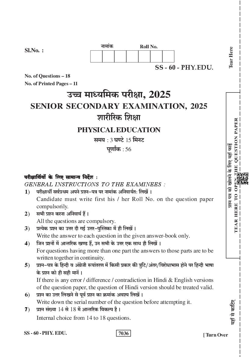 Rajasthan Board Class 12 Question Paper 2025 Physical Education View Download
