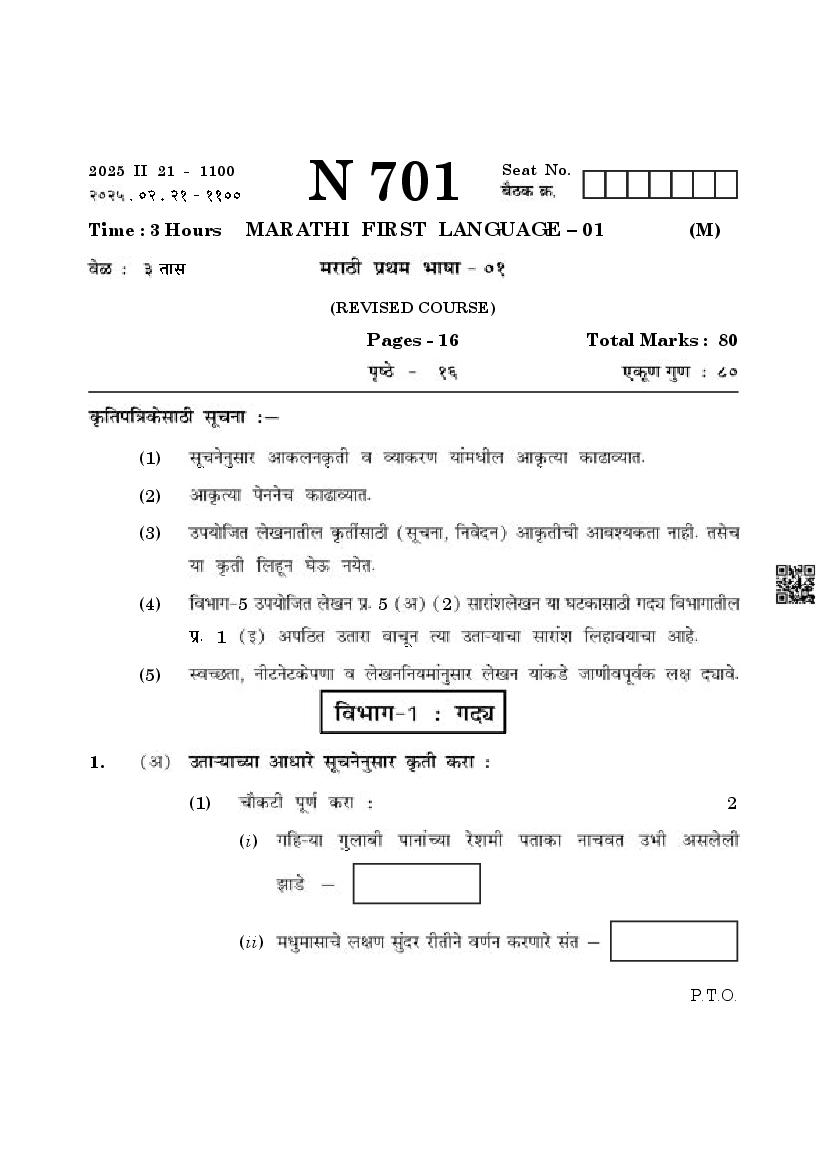 Maharashtra SSC Marathi Question Paper 2025 PDF
