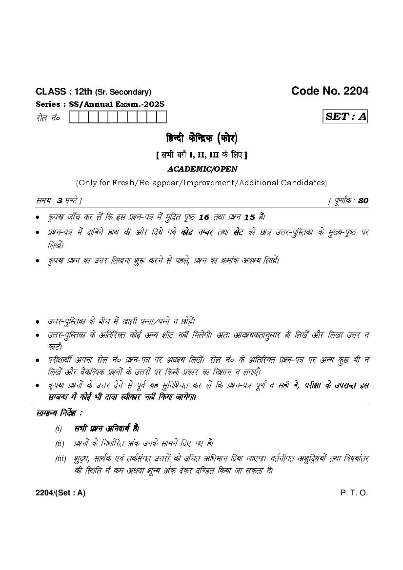 HBSE Class 12 Question Paper 2025 Hindi Core View Download