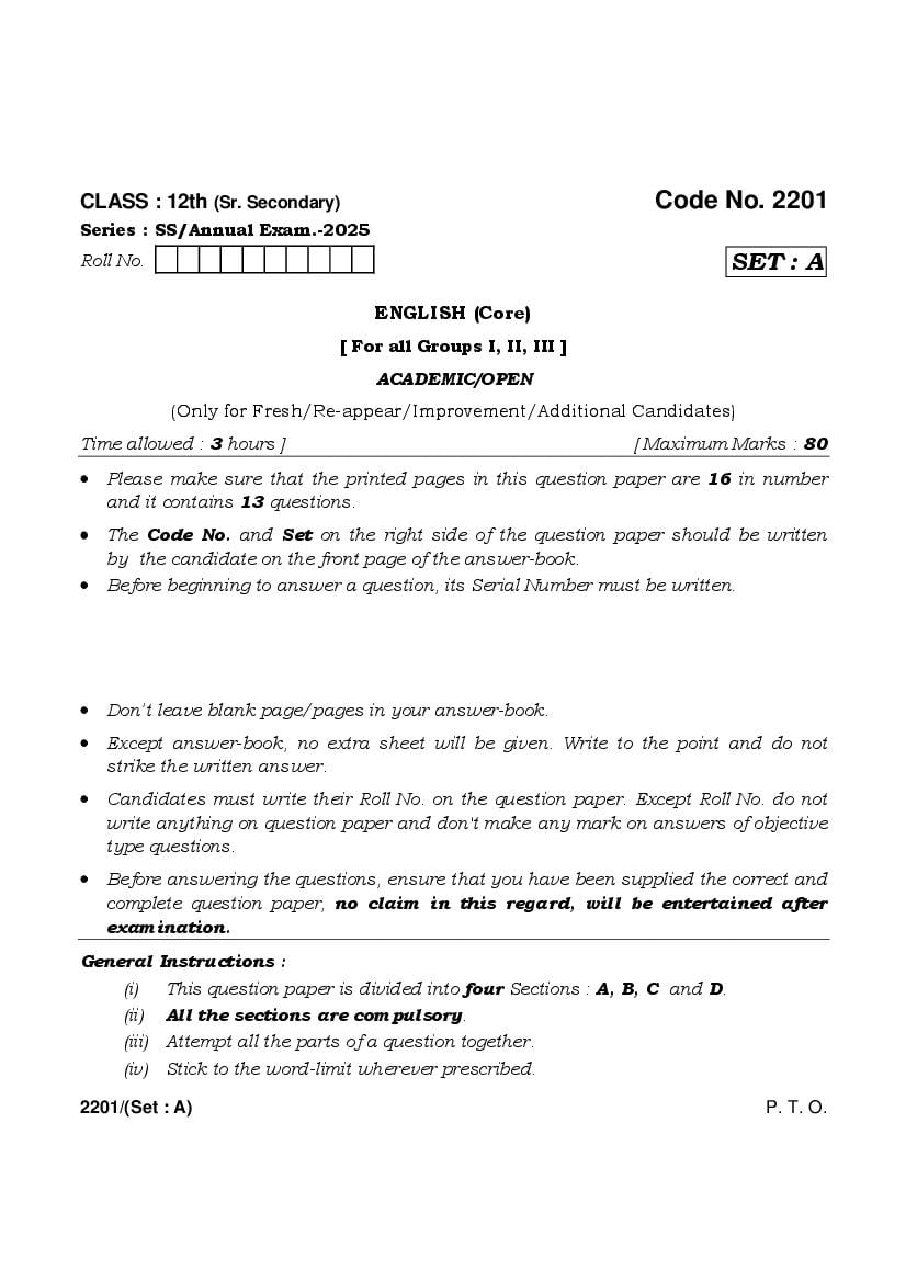 HBSE Class 12 Question Paper 2025 English Core View Download