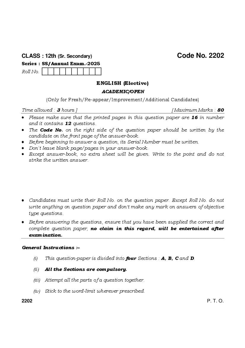 HBSE Class 12 Question Paper 2025 English Elective View Download