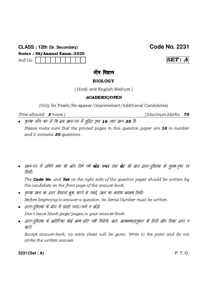 HBSE Class 12 Question Paper 2025 Biology View Download