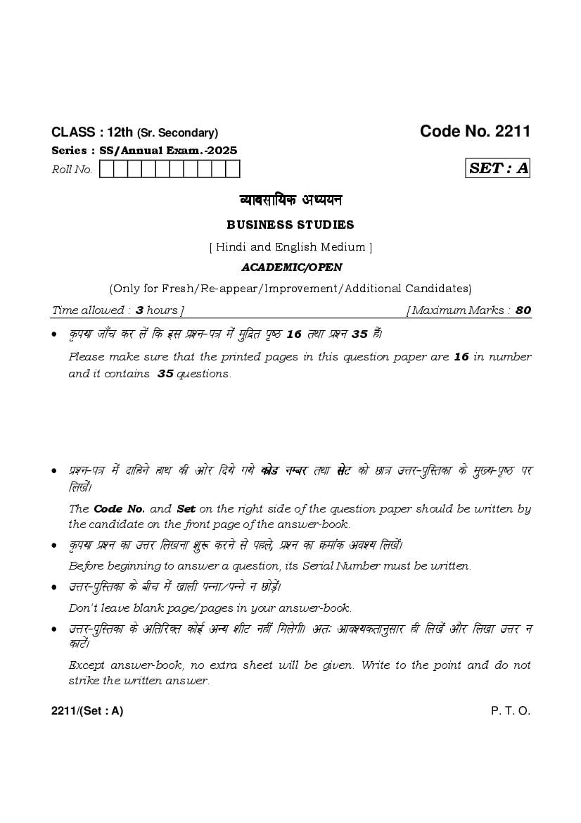 HBSE Class 12 Question Paper 2025 Business Study View Download
