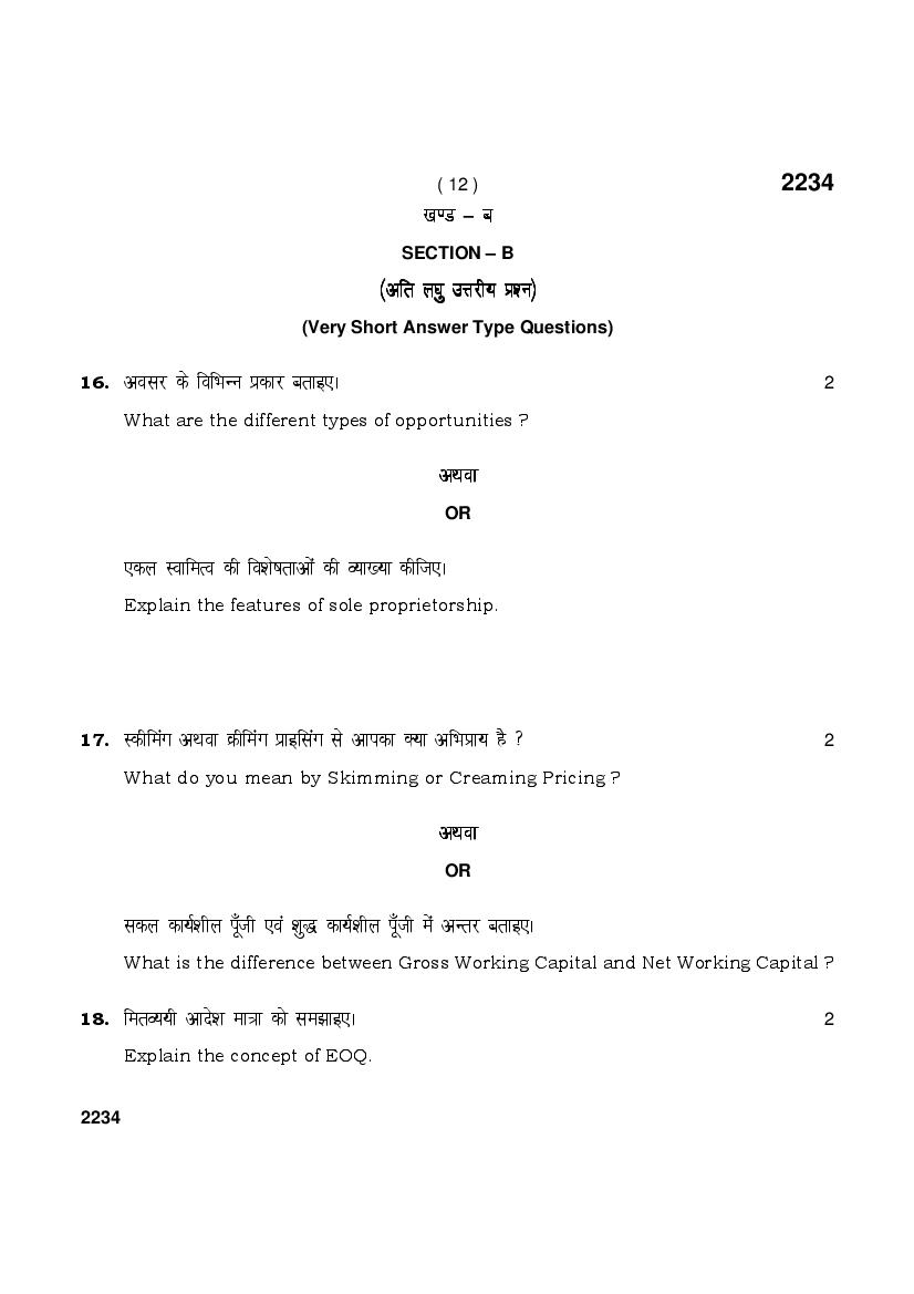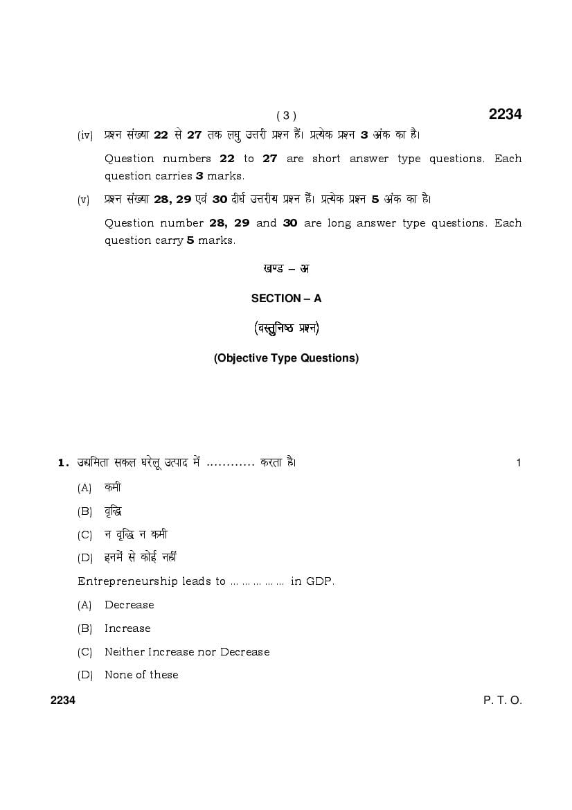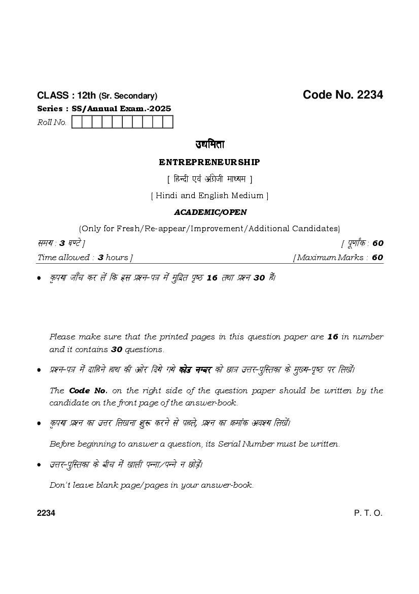 HBSE Class 12 Question Paper 2025 Entrepreneurship View Download