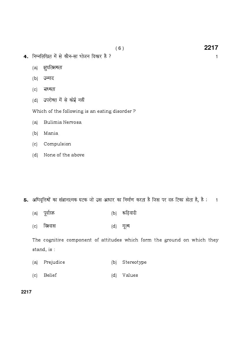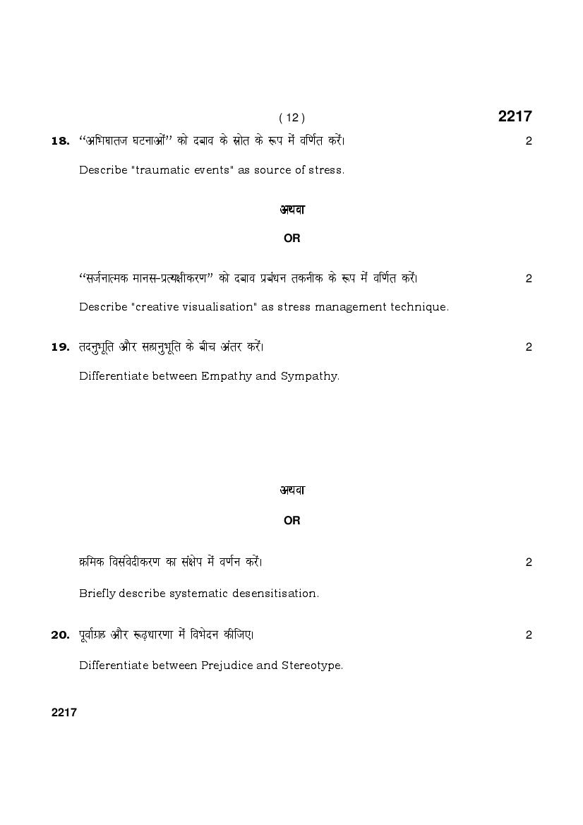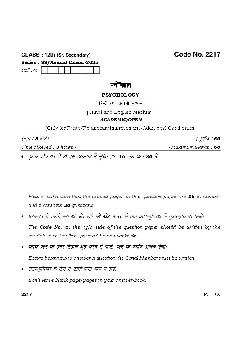 HBSE Class 12 Question Paper 2025 Psychology View Download