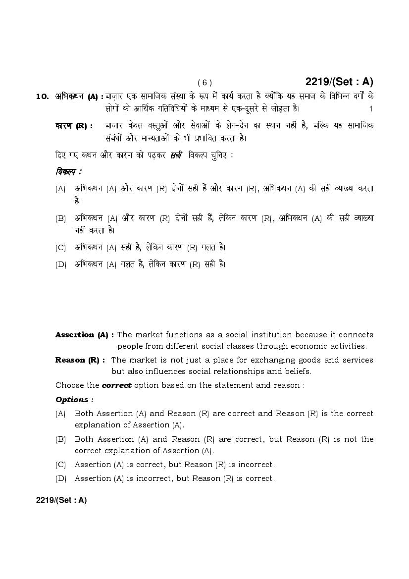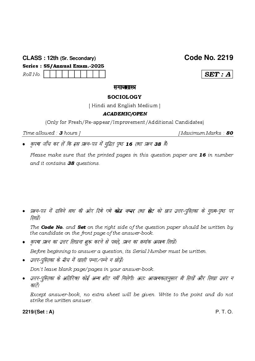 HBSE Class 12 Question Paper 2025 Sociology View Download