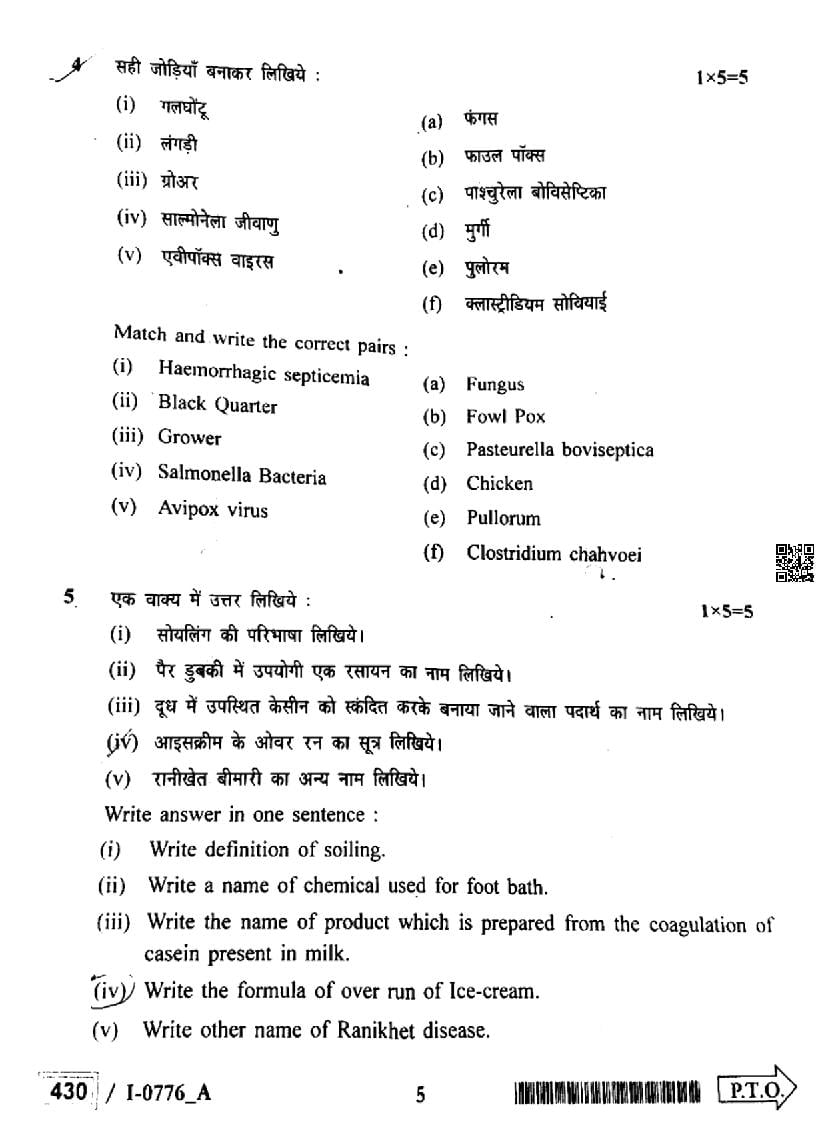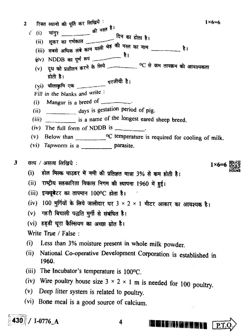 MP Board Class 12 Animal Husbandary, Milk Trade, Poultry and Fisheries Question Paper