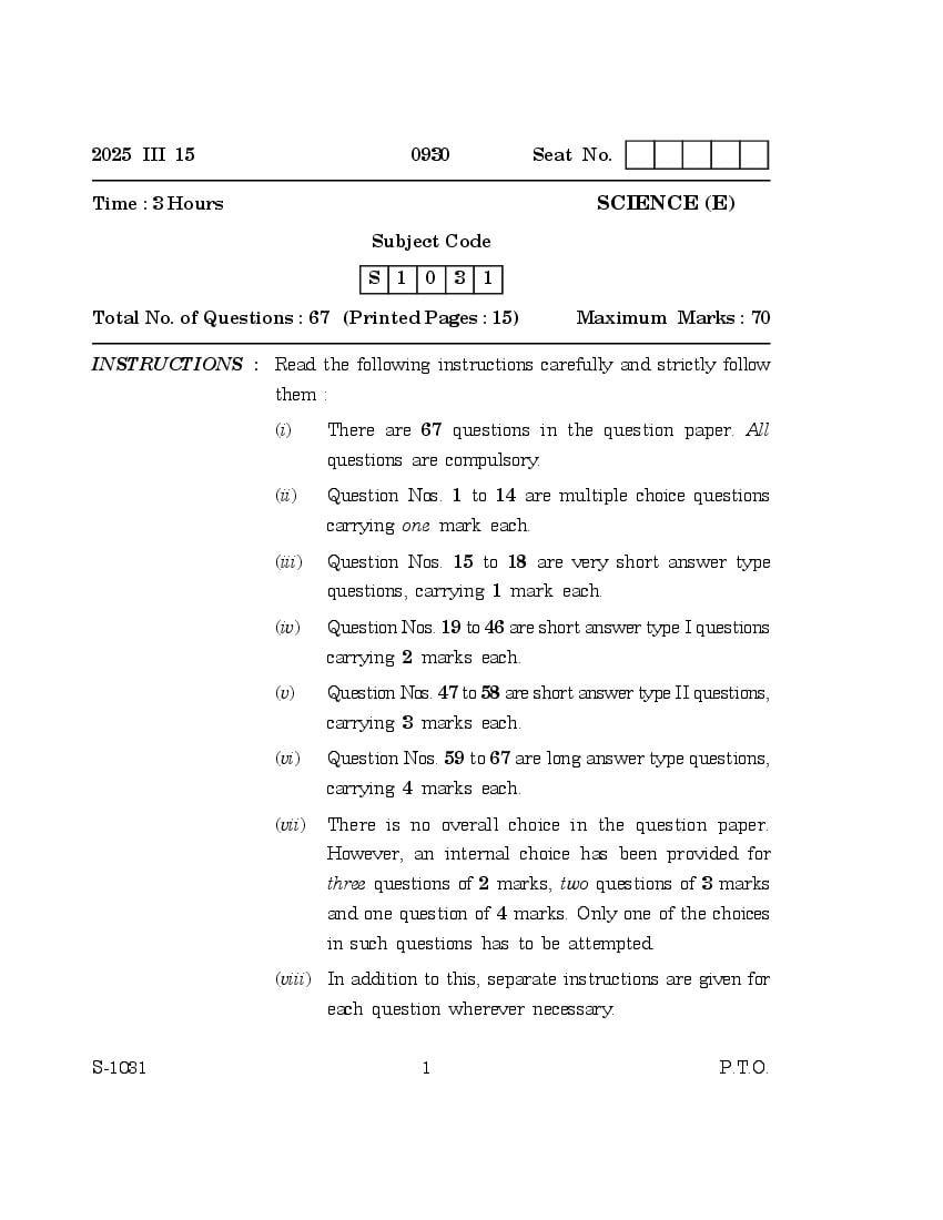 Goa Board Class 10 Question Paper 2025 Science View Download