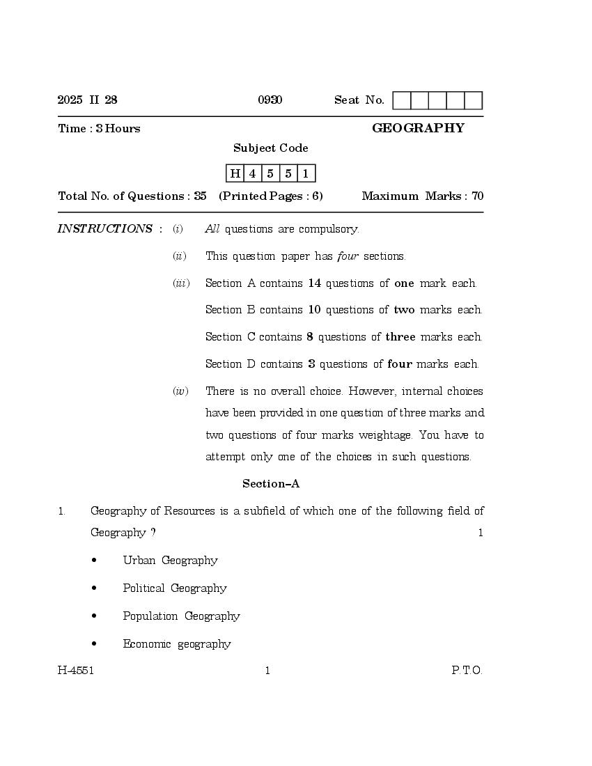 Goa Board Class 12 Question Paper 2026, 2025 for Geography – Download PDF Here