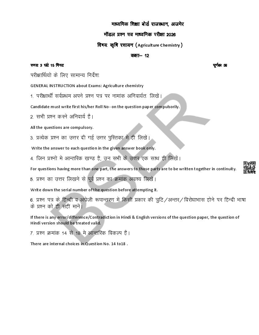 Rajasthan Board 12th Model Paper 2026 Agriculture Chemistry View Download