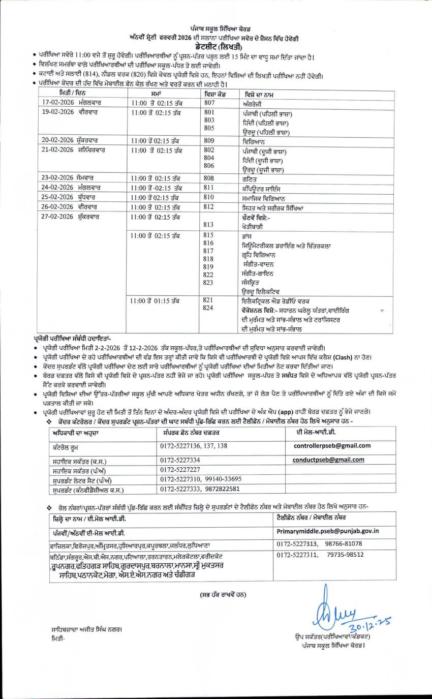 PSEB 8th Date Sheet 2026 View Download