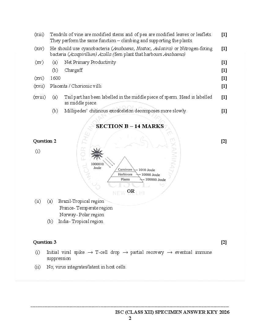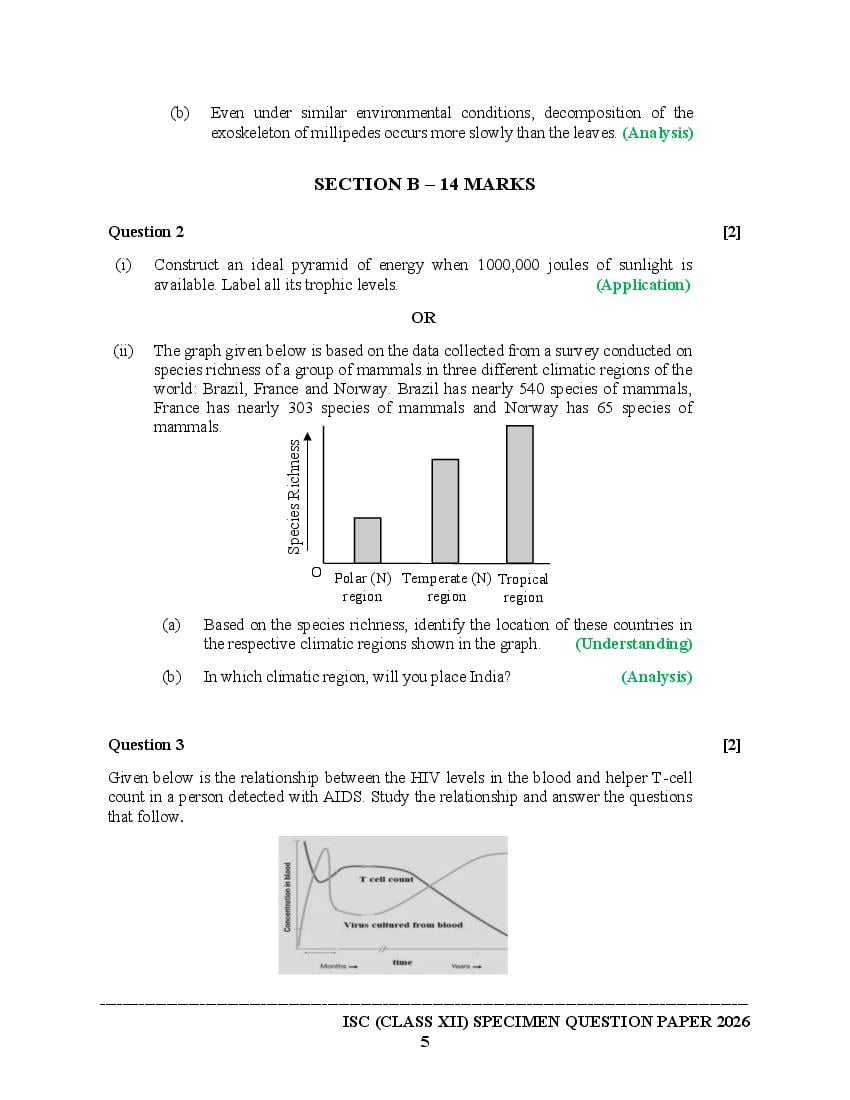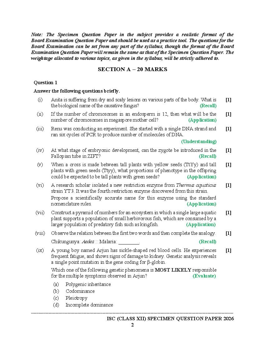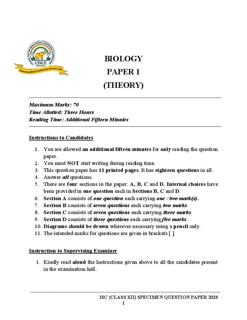 The specimen paper for ISC 2026, for Biology is now available. The direct link to download PDF of this ISC specimen paper 2026 is as follows.