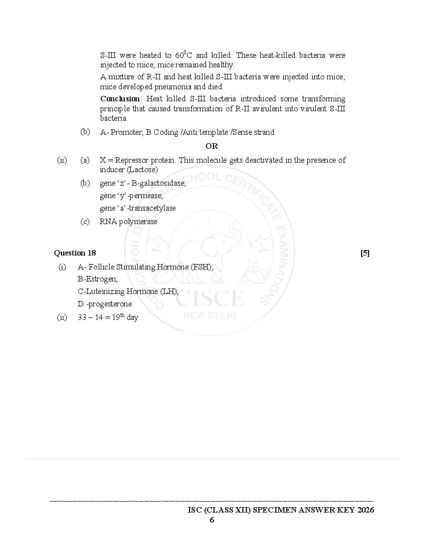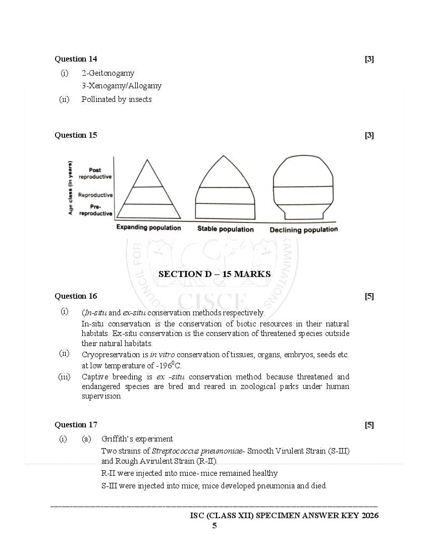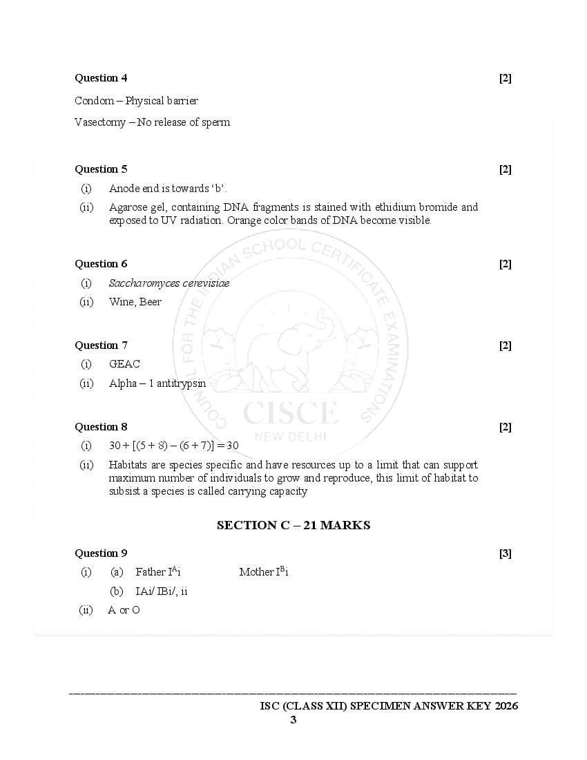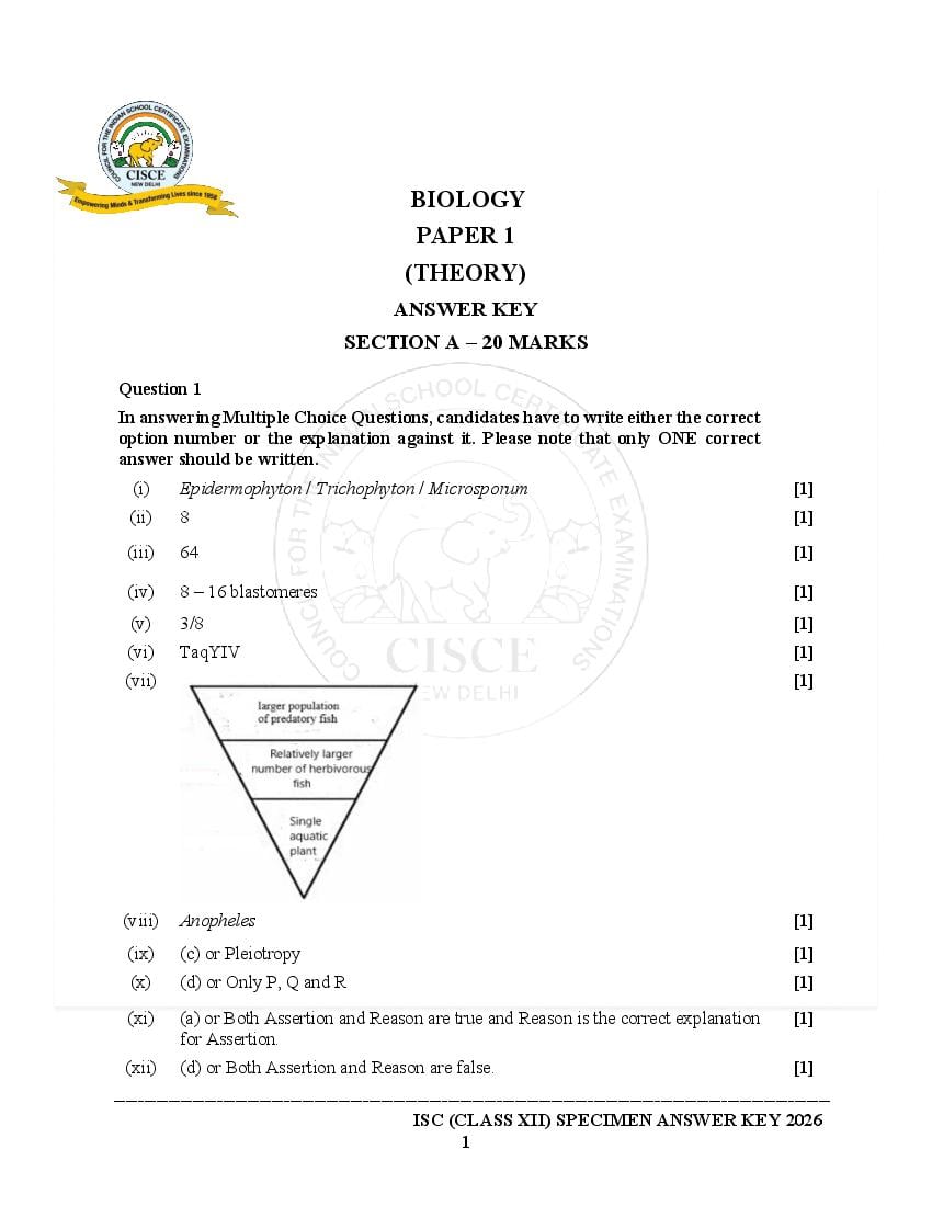 Please note: Council for the Indian School Certificate Examinations (CISCE) has released the CISCE Specimen Papers for 2026 (for the 2025-26) session at cisce.org. However they have published ISC sample papers of only a limited subjects in this session. You can see the latest released Biology specimen paper 2026 here on this page. If the year on the ISC Biology paper is older, then it means that that is the last class 12 Biology sample paper that the board released. Usually the board releases new Biology specimen paper if there is a change in the 12th standard syllabus for that subject.