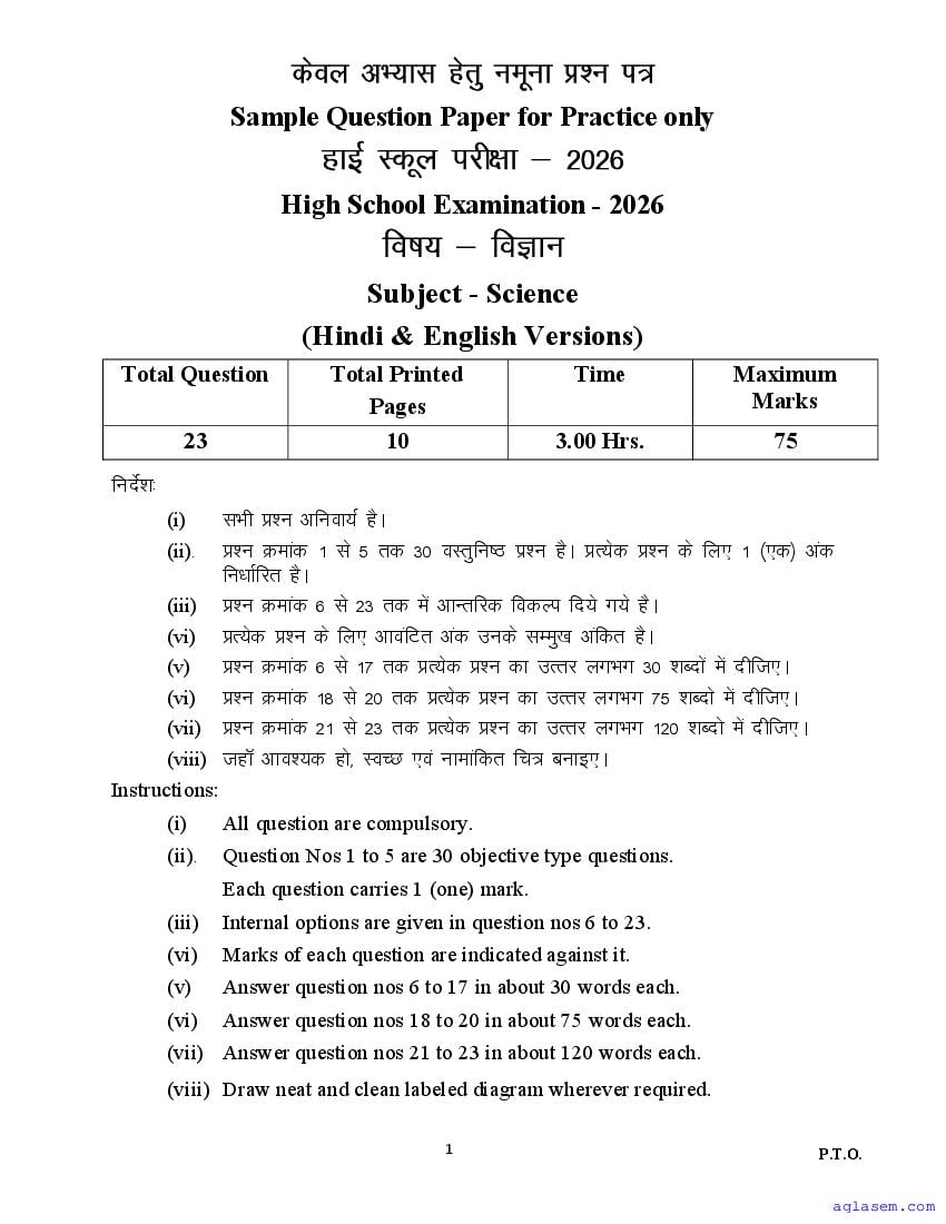 MP Board 10th Science Sample Paper 2026 is published by MPBSE. If you are a class 10 student, then you can download MP Board Class 10 Sample Paper 2026 for Science PDF here from aglasem. This Science question paper in English medium and Hindi medium contains sample questions from the latest MPBSE class 10 syllabus. Moreover the class 10 Science question paper pattern will be exactly as per this MP Board 10th sample paper. Thus you increase chances of scoring full marks in MP Board 10th result 2026 by practicing with this Science model paper.