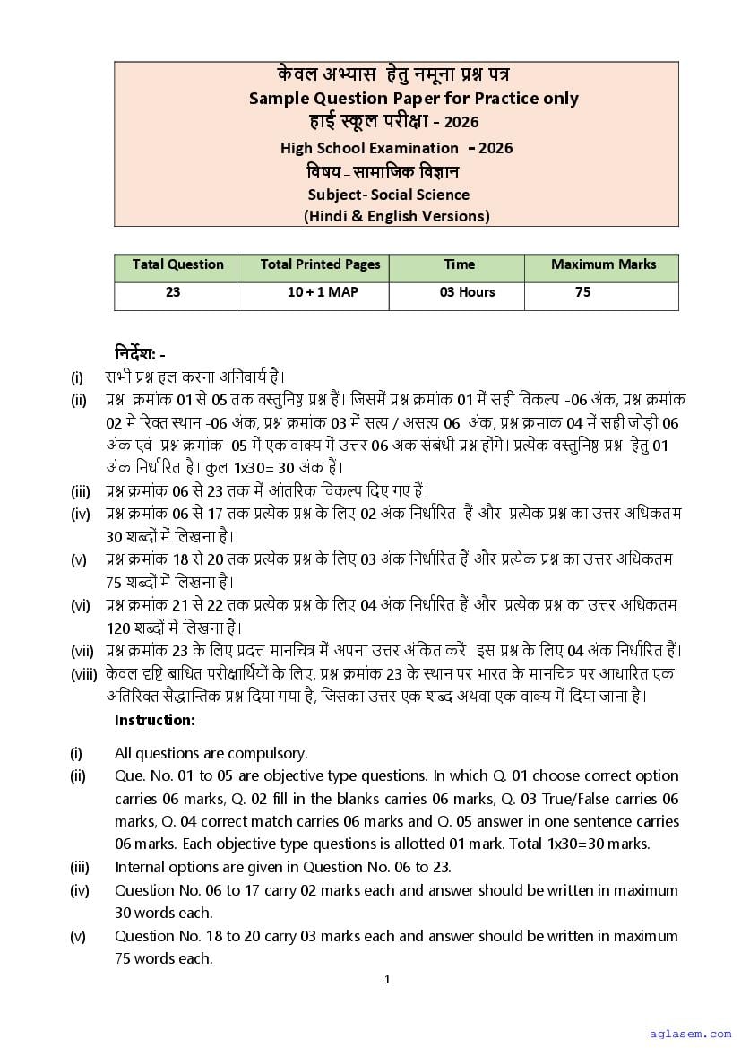 MP Board 10th Social Science Sample Paper 2026 is published by MPBSE. If you are a class 10 student, then you can download MP Board Class 10 Sample Paper 2026 for Social Science PDF here from aglasem. This Social Science question paper in English medium and Hindi medium contains sample questions from the latest MPBSE class 10 syllabus. Moreover the class 10 Social Science question paper pattern will be exactly as per this MP Board 10th sample paper. Thus you increase chances of scoring full marks in MP Board 10th result 2026 by practicing with this Social Science model paper.