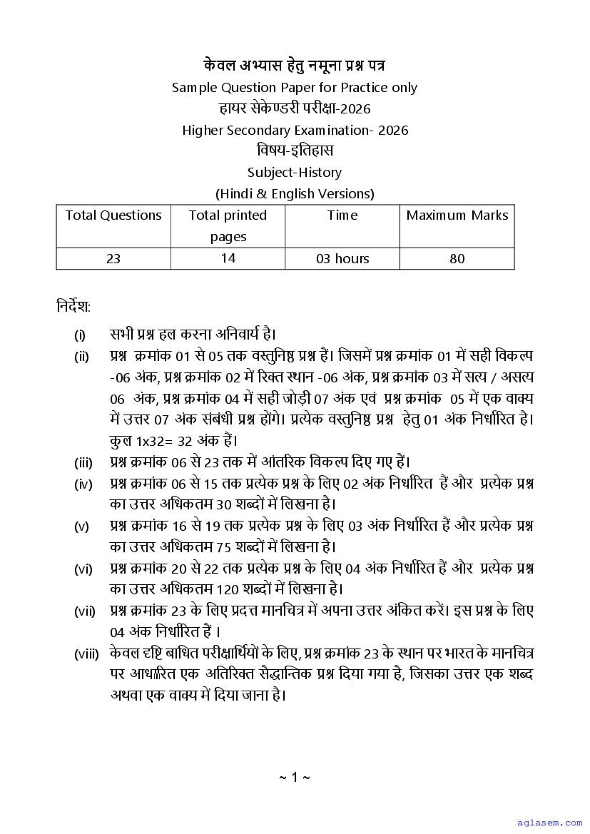 MP Board 12th History Sample Paper 2026 is published by MPBSE. If you are a class 12 student, then you can download MP Board Class 12 Sample Paper 2026 for History PDF here from aglasem. This History question paper in English medium and Hindi medium contains sample questions from the latest MPBSE class 12 syllabus. Moreover the class 12 History question paper pattern will be exactly as per this MP Board 12th sample paper. Thus you increase chances of scoring full marks in MP Board 12th result 2026 by practicing with this History model paper.