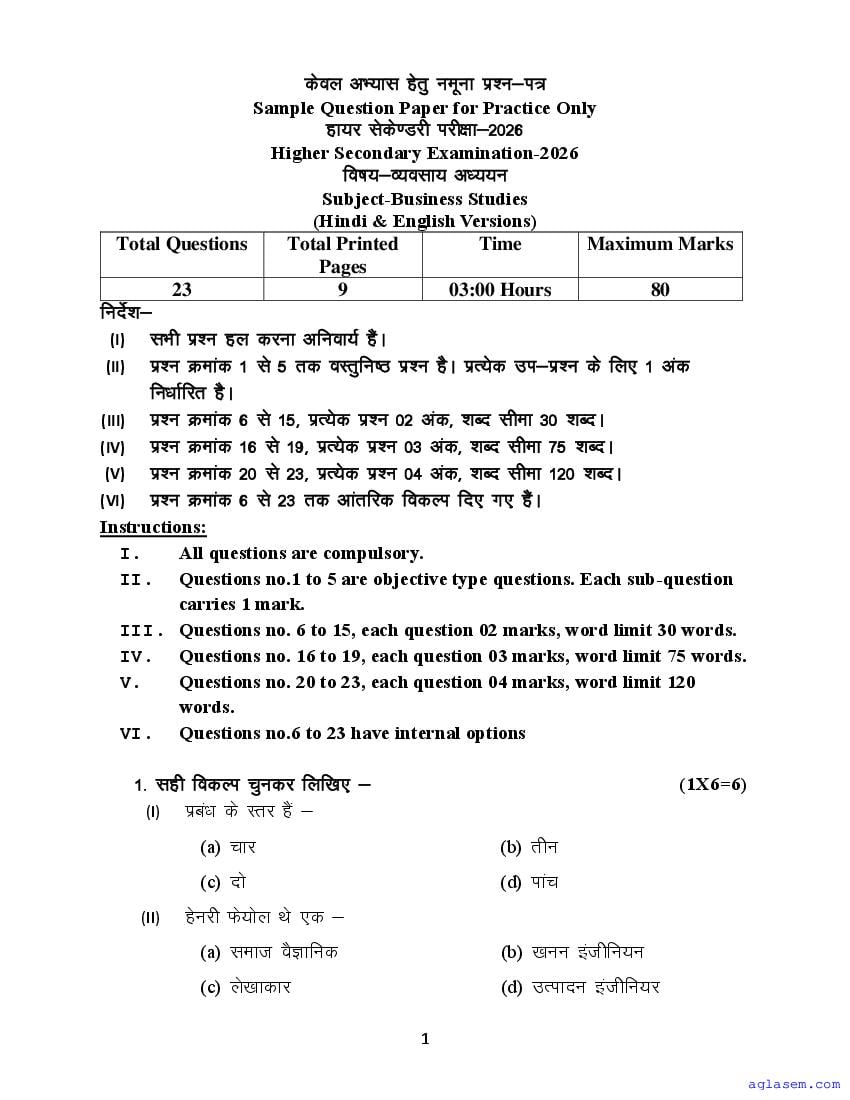 MP Board 12th Business Studies Sample Paper 2026 is published by MPBSE. If you are a class 12 student, then you can download MP Board Class 12 Sample Paper 2026 for Business Studies PDF here from aglasem. This Business Studies question paper in English medium and Hindi medium contains sample questions from the latest MPBSE class 12 syllabus. Moreover the class 12 Business Studies question paper pattern will be exactly as per this MP Board 12th sample paper. Thus you increase chances of scoring full marks in MP Board 12th result 2026 by practicing with this Business Studies model paper.