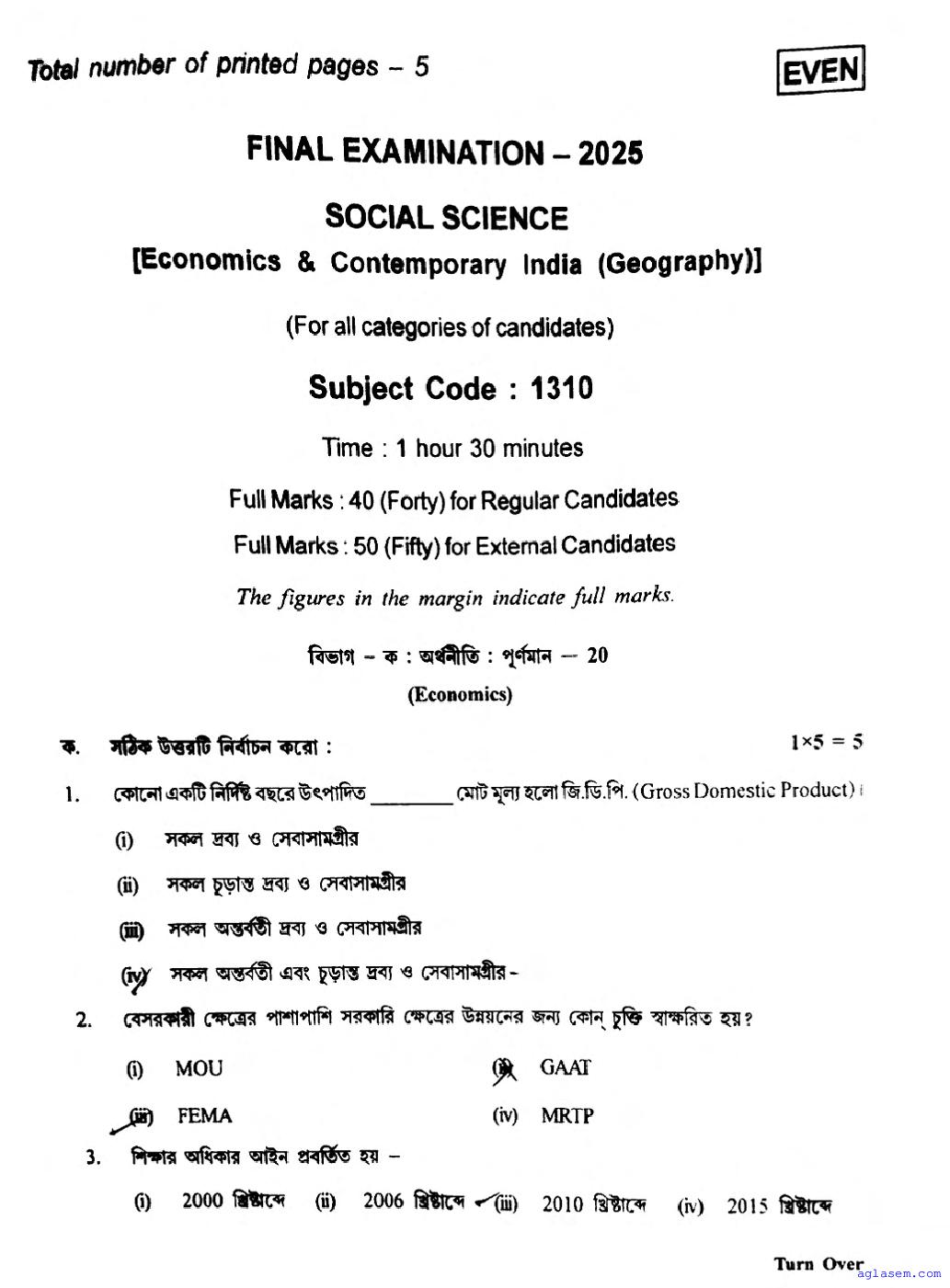 To help students achieve better results, we have provided the TBSE Madhyamik Social Science Question Paper here at aglasem.com. This question paper can be downloaded in PDF format for offline practice.