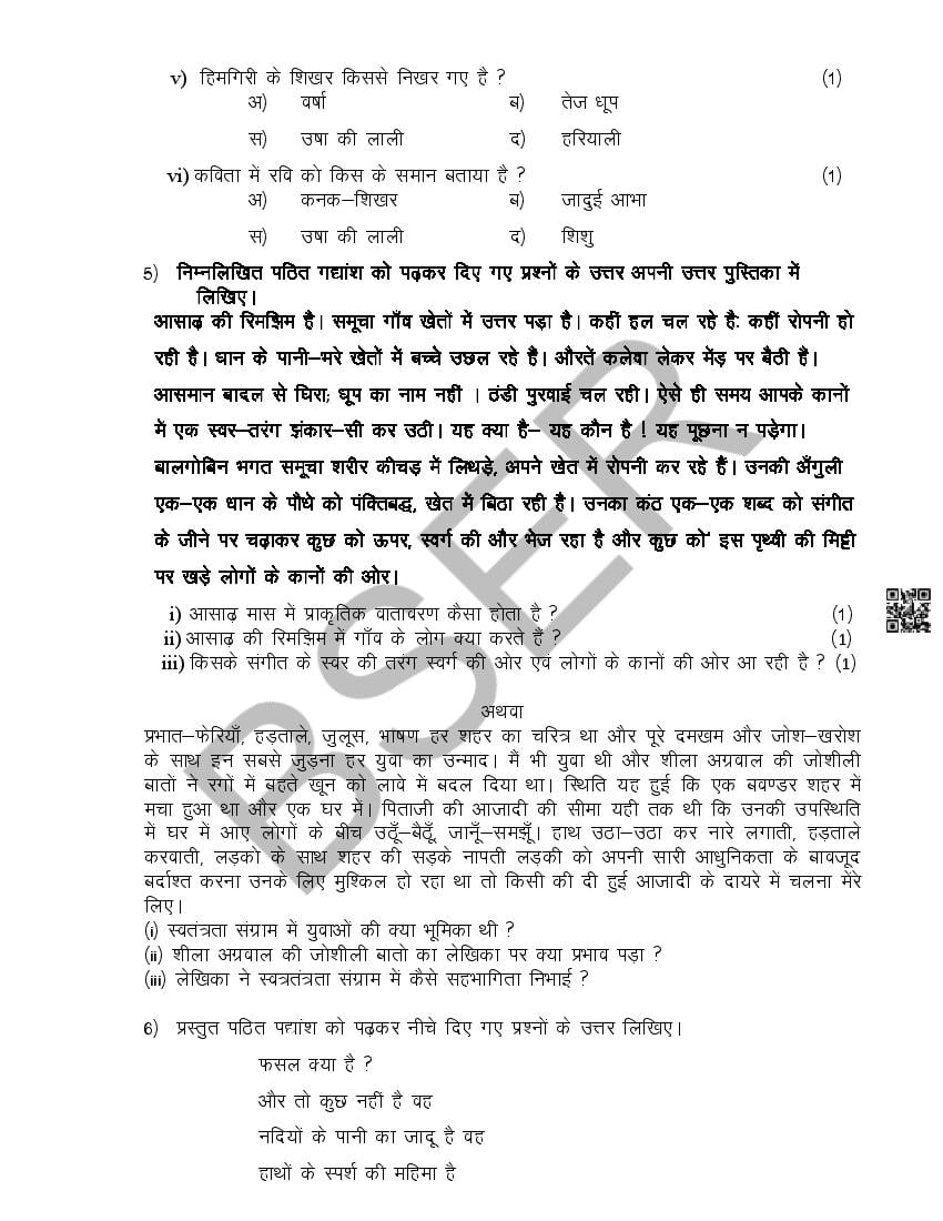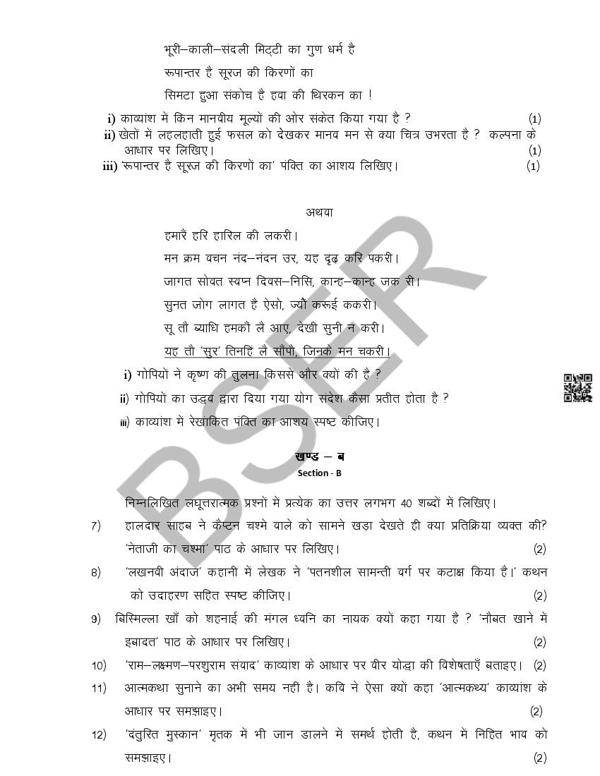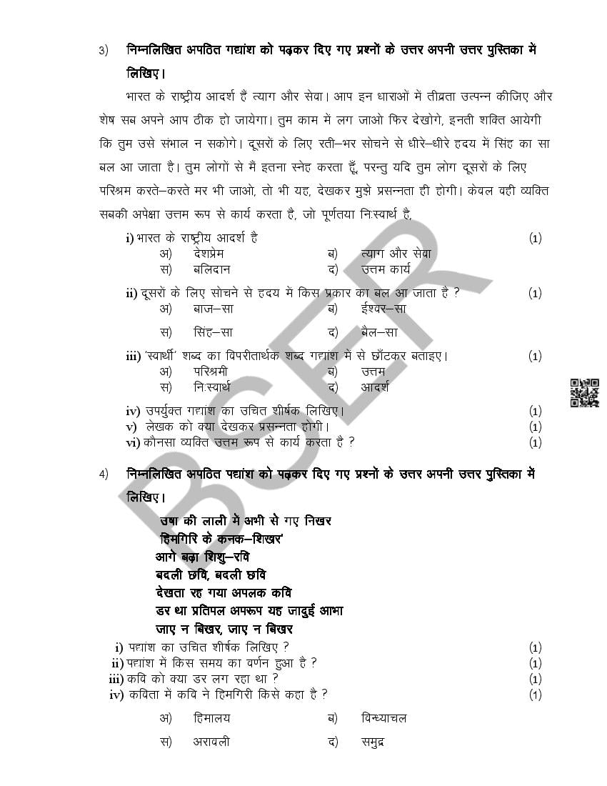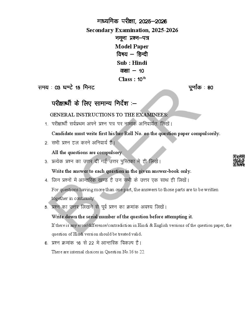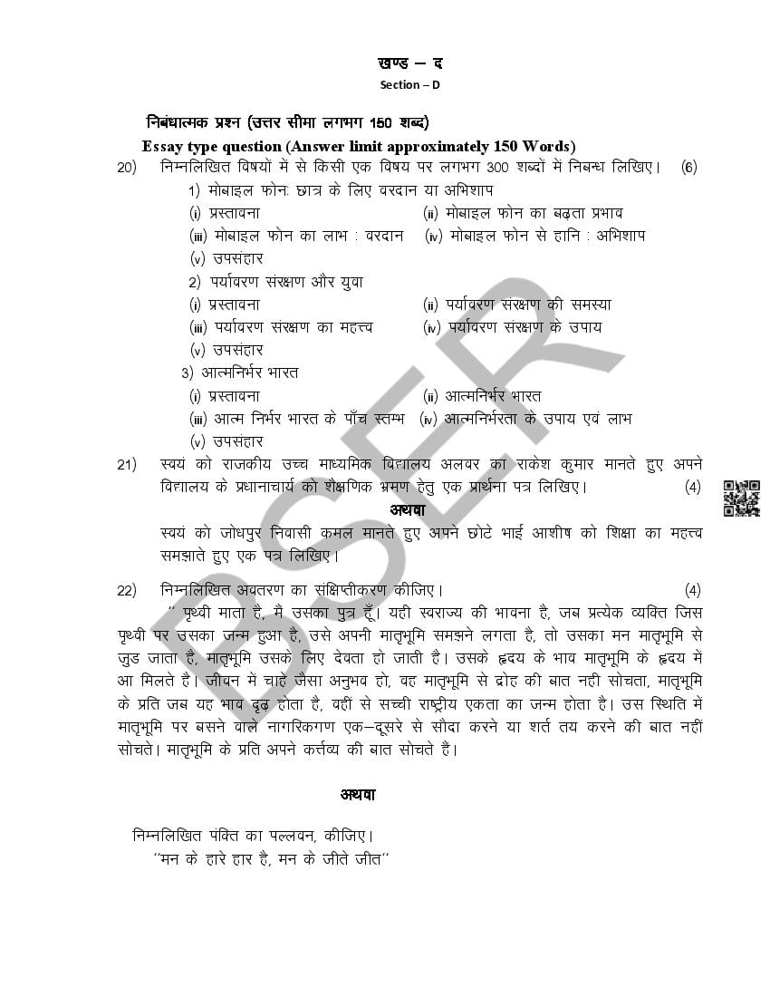The Rajasthan Board model paper for class 10 Hindi is as follows.