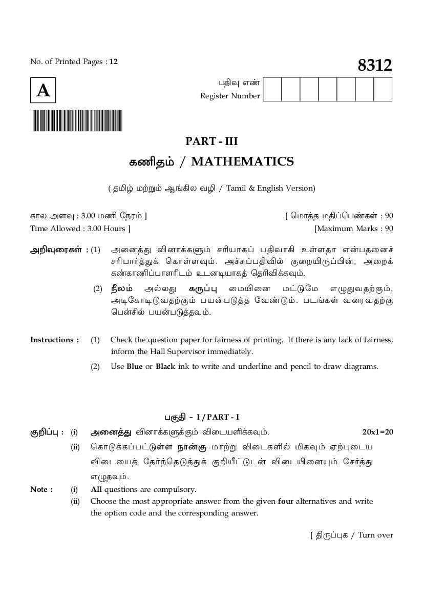 TN 12th Public Exam Maths Question Paper 2026