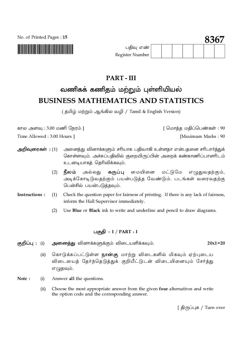 TN 12th Public Exam Business Mathematics & Statistics Question Paper 2026 is the previous year question paper of Business Mathematics & Statistics subject. If you are preparing for Tamil Nadu board exams for HSE (+2) standard, then you can download the 12th Business Mathematics & Statistics Question Paper PDF to see question type, difficulty level, exam pattern. Here you will find the 12th Public Exam Question Paper for Business Mathematics & Statistics, and you can use it with the Business Mathematics & Statistics model paper to enhance your exam preparation.