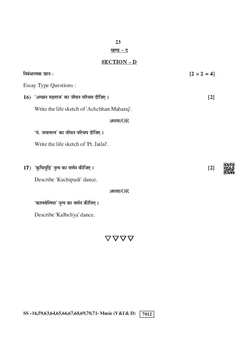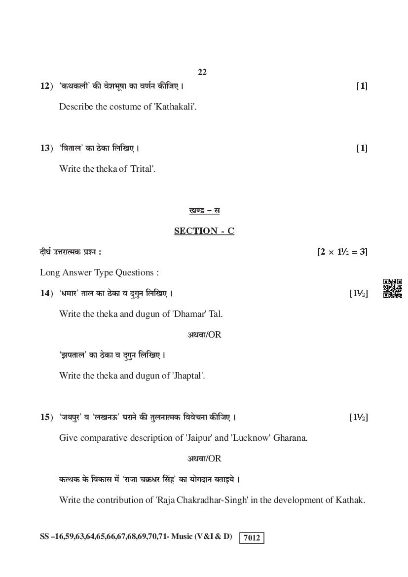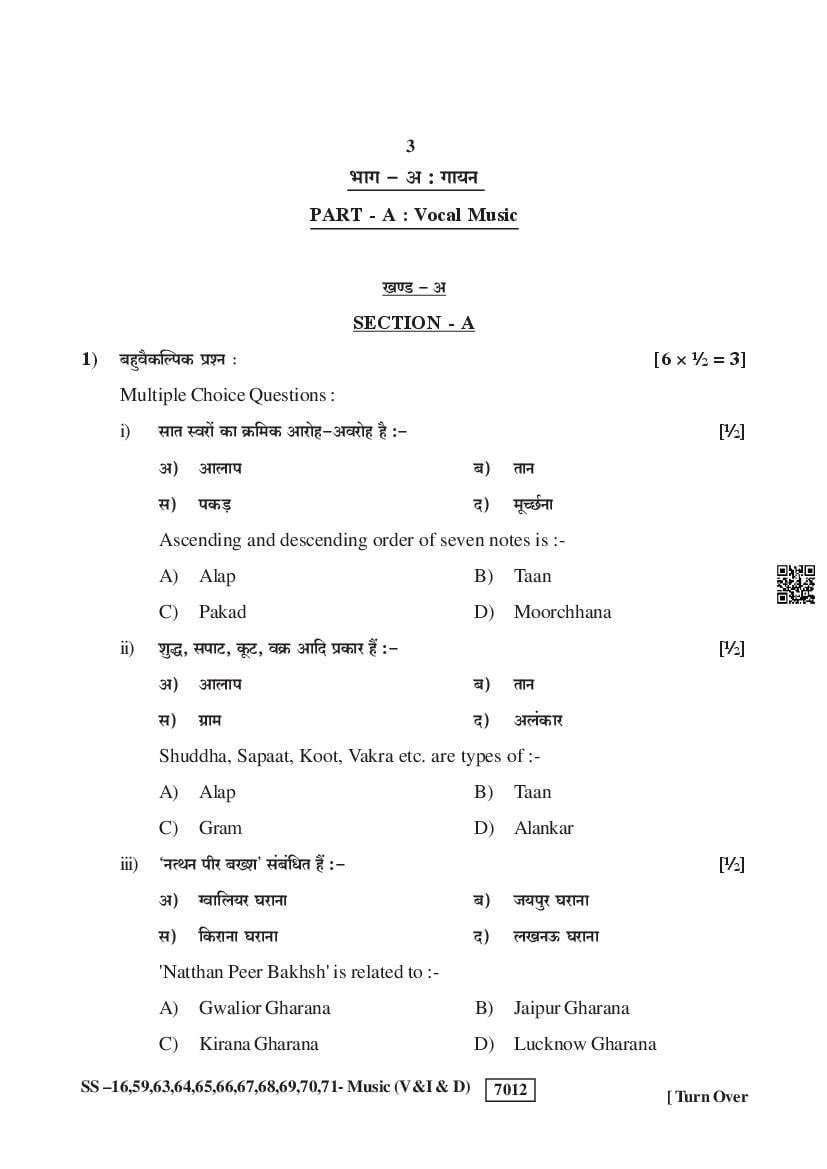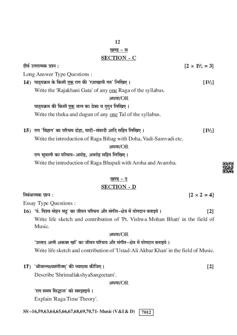 Rajasthan Board Class 12 Music Question Paper