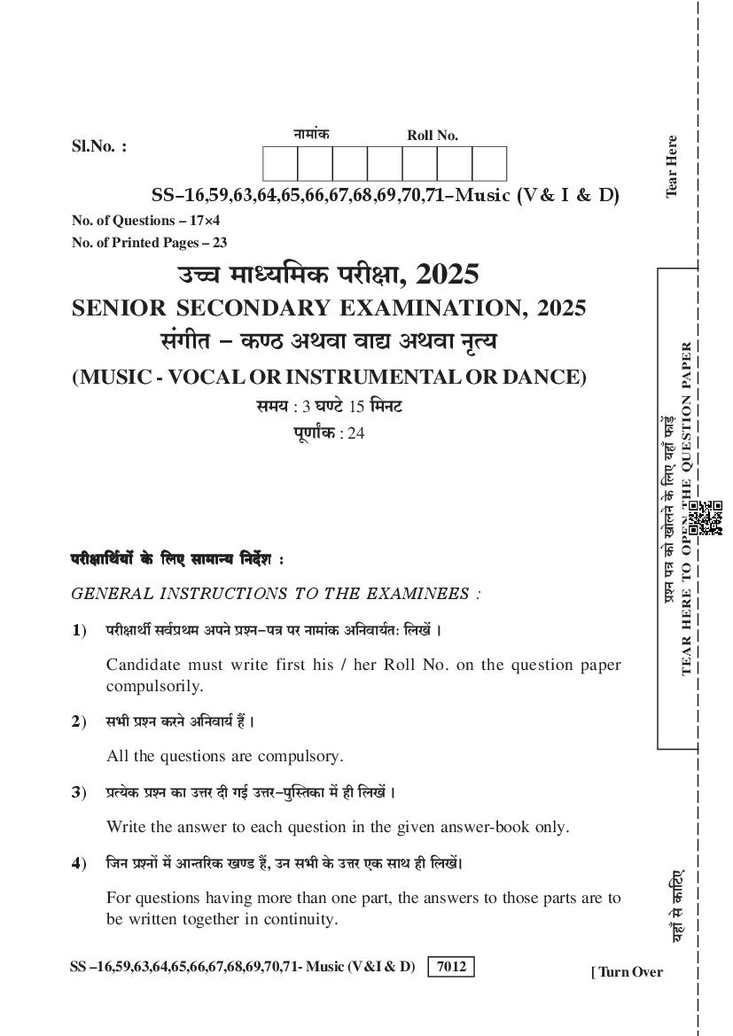 Rajasthan Board Class 12 Question Paper 2025 Music View Download