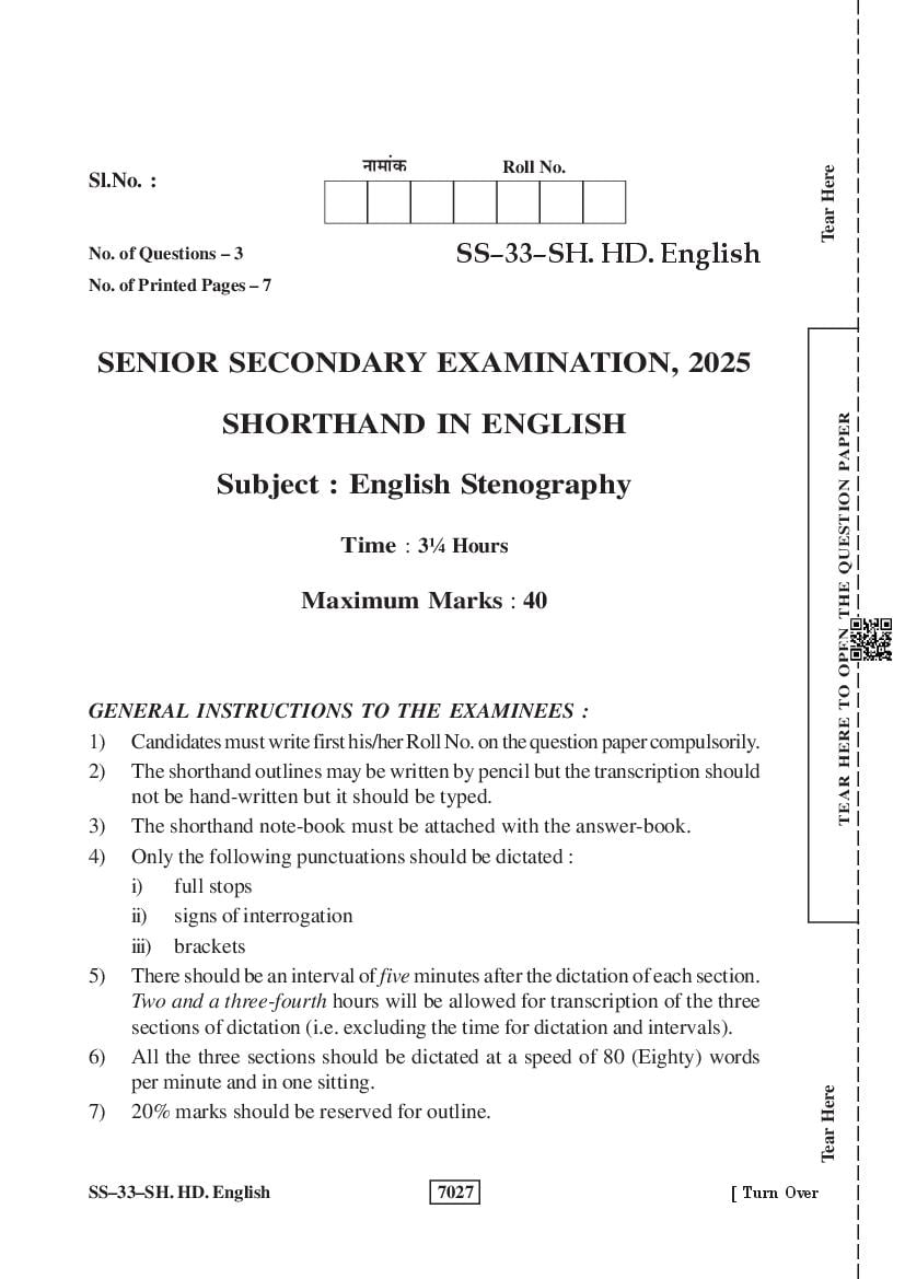 RBSE 12th Shorthand in English Question Paper 2025 PDF is given below.