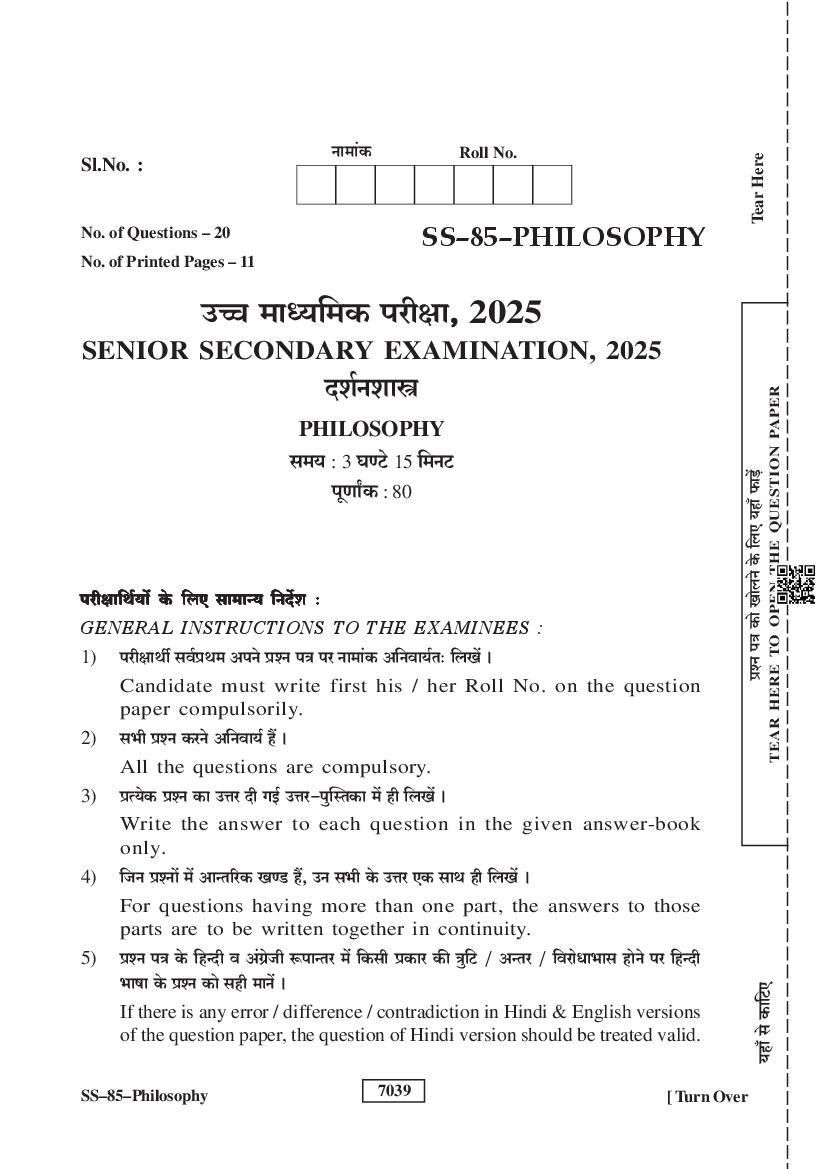 Rajasthan Board Class 12 Question Paper 2025 Philosophy View Download