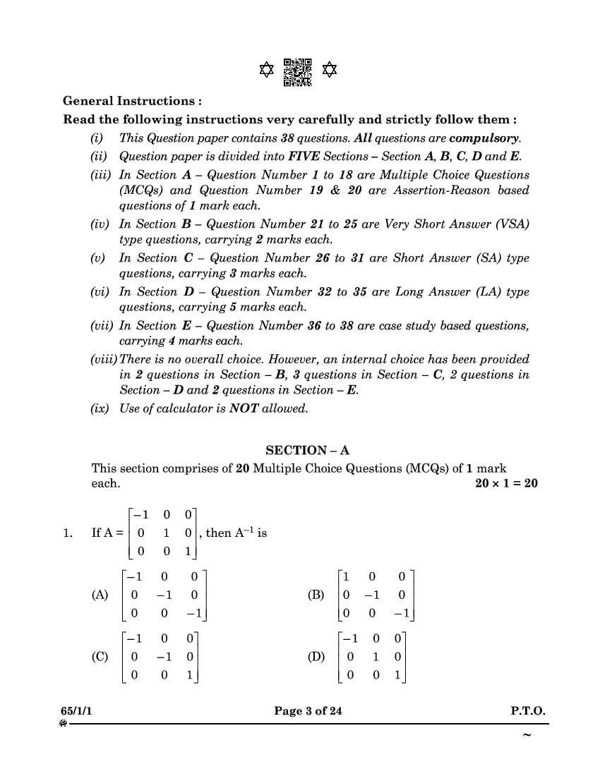CBSE Class 12 Maths Question Paper 2024 PDF Download Link – Click Here to Download Question Paper