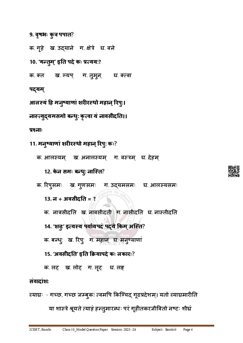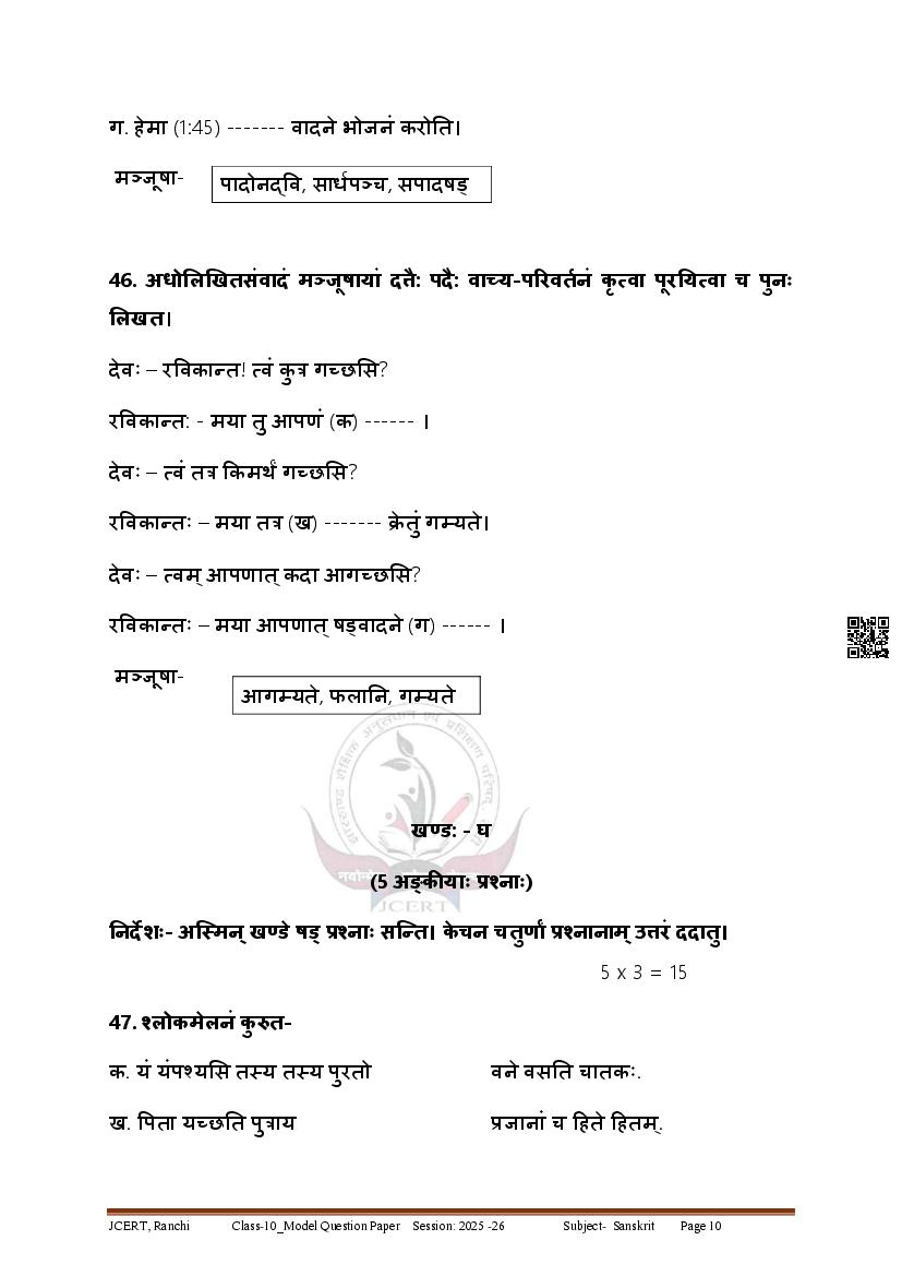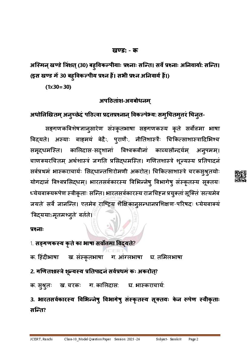 JAC Class 10 Model Question Paper 2026 Sanskrit View Download
