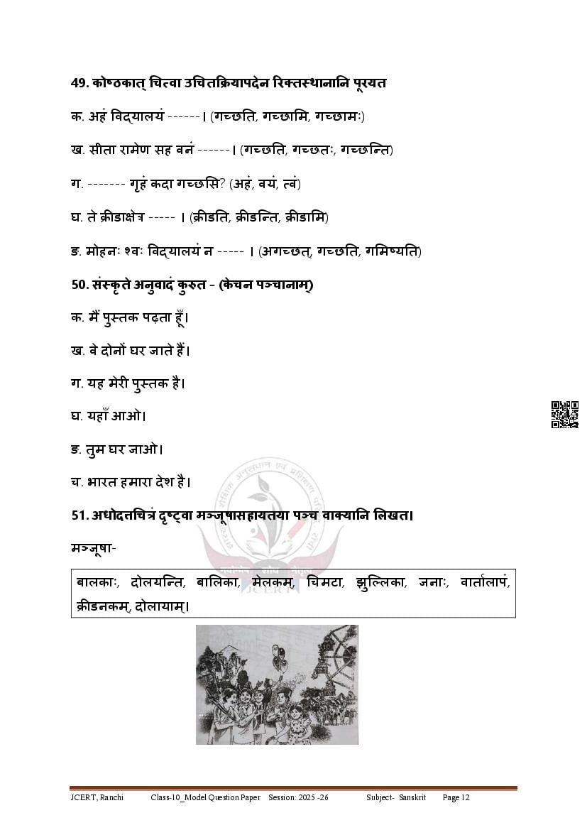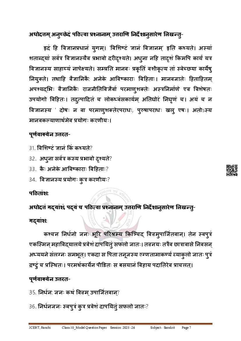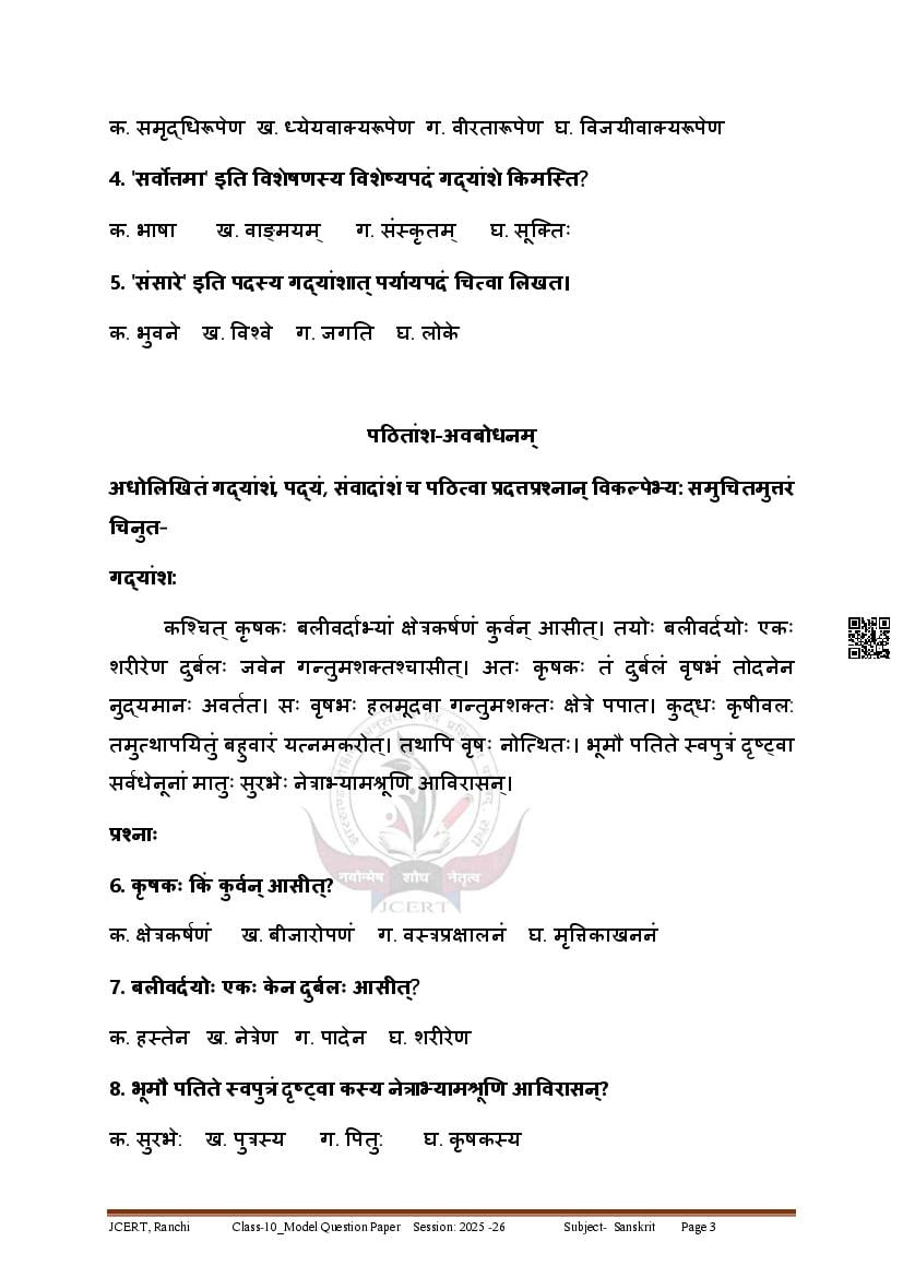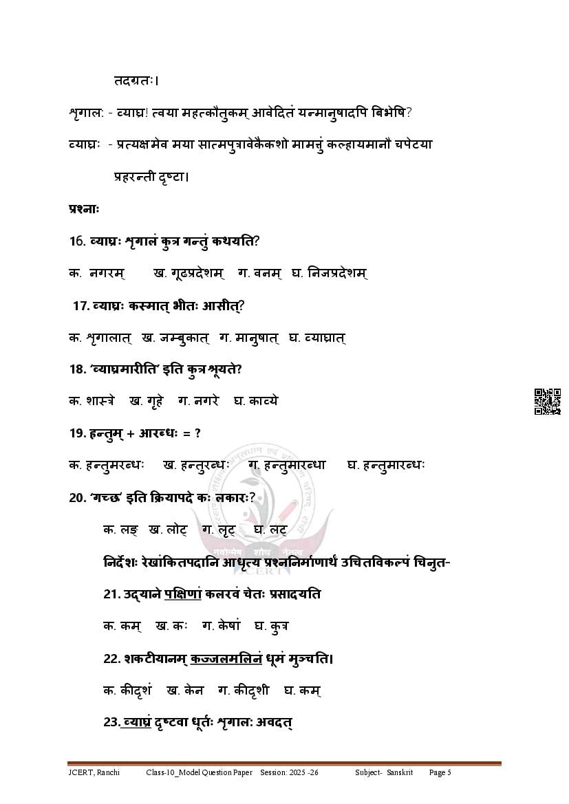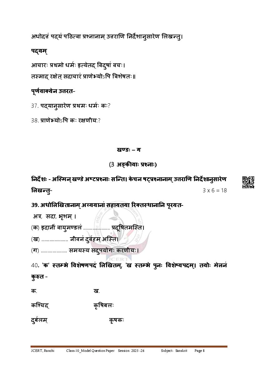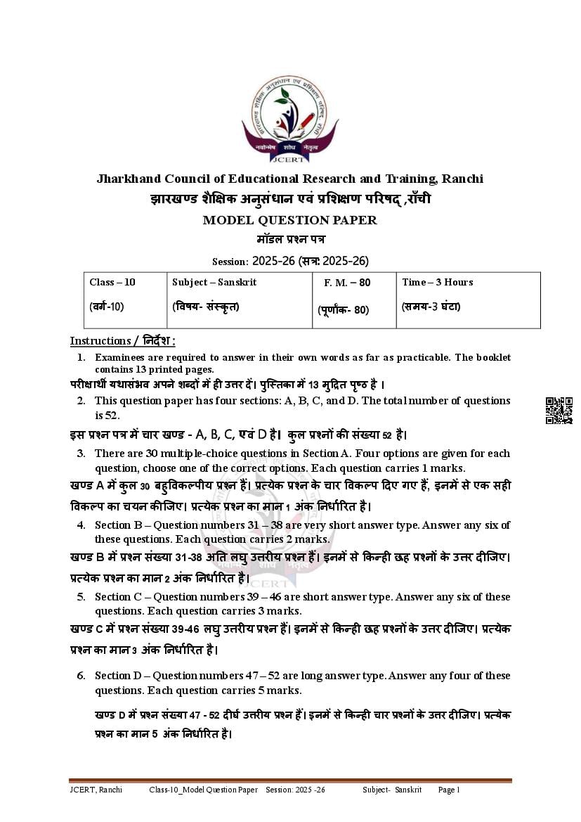 JAC 10th Sanskrit Model Question Paper 2025 Download Link – Click Here to Download Paper PDF