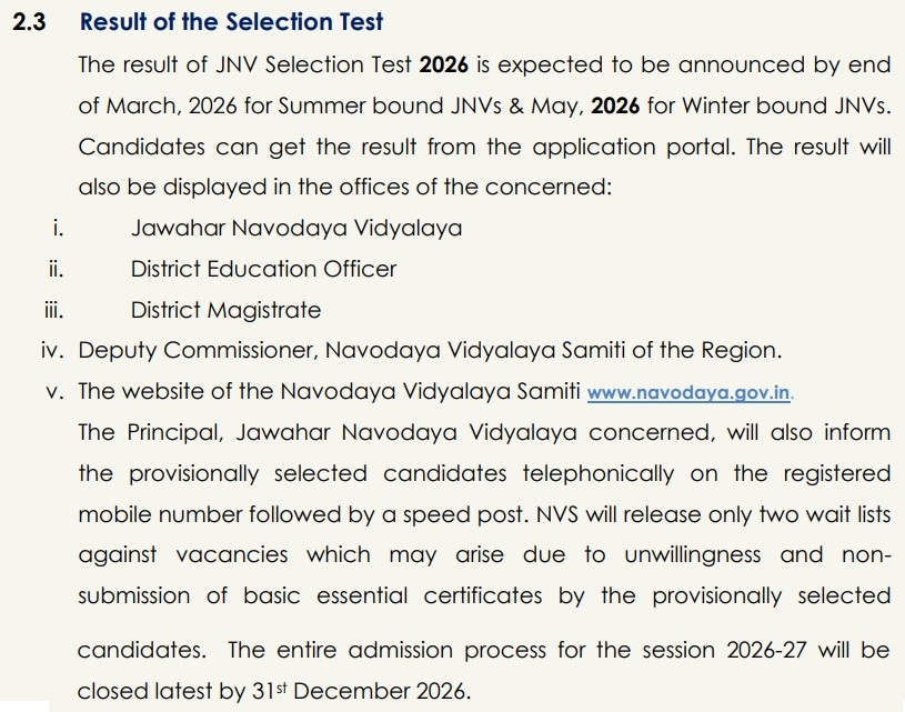 Navodaya Class 6 Result DateMar 2026 – Phase 1