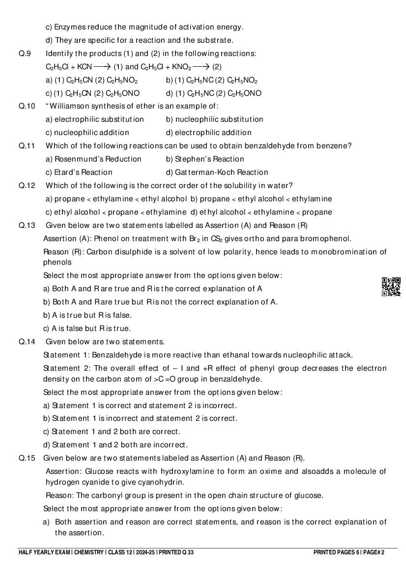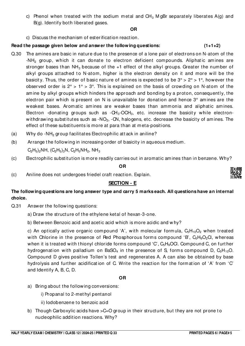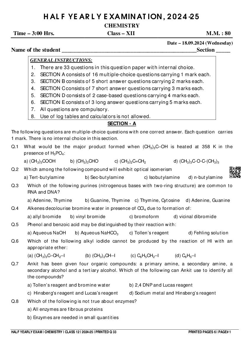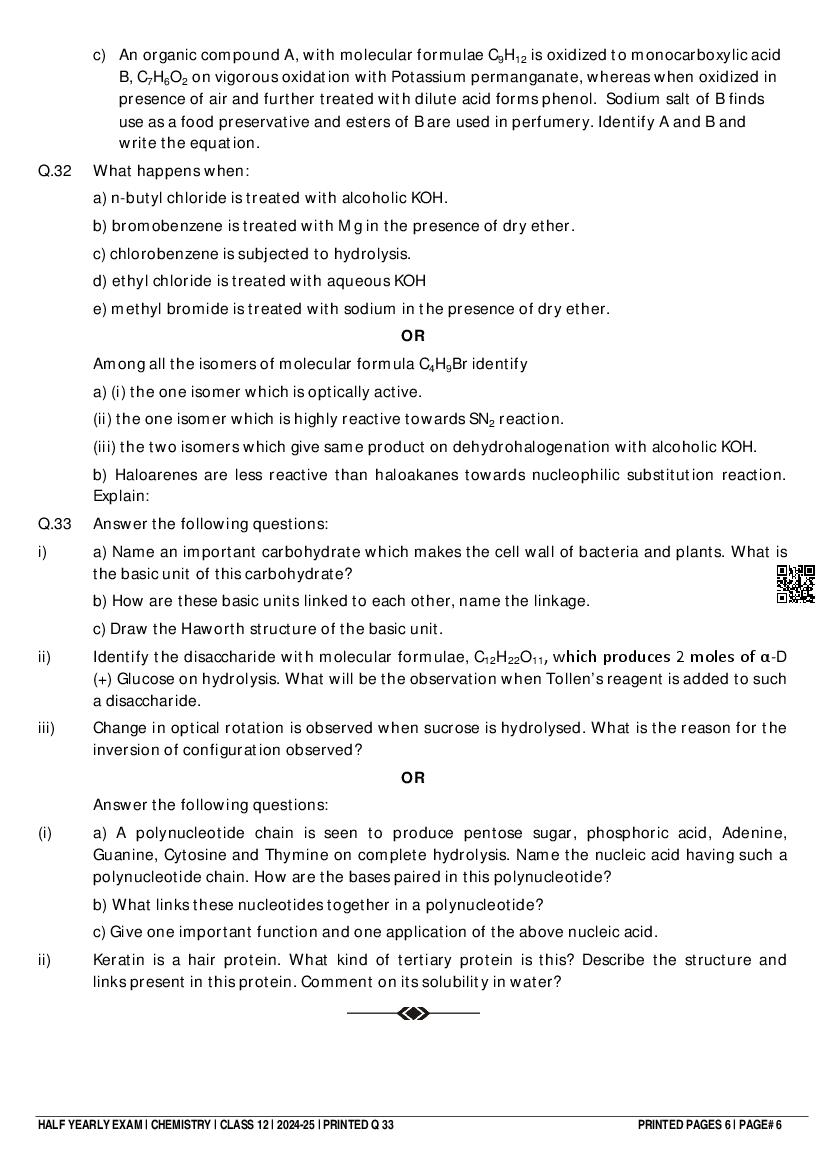 Class 12 Chemistry Half Yearly Question Paper 2025 PDF