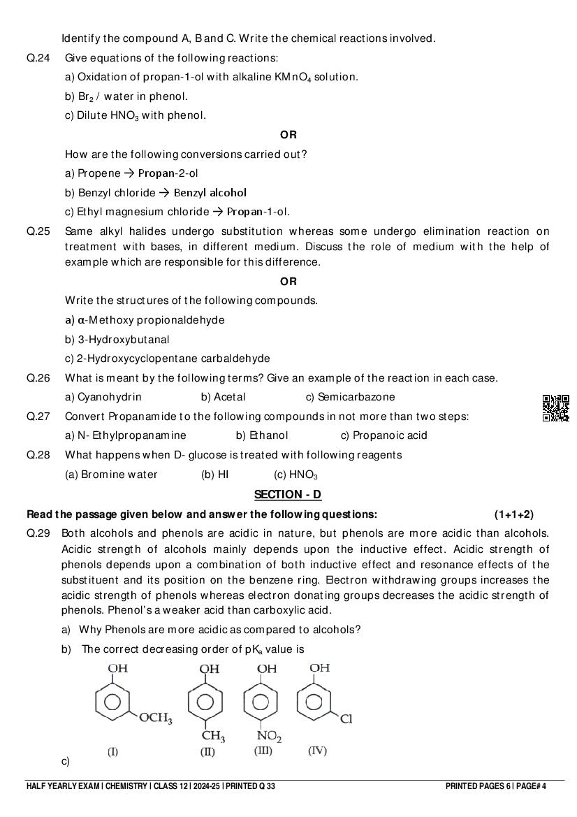 Class 12 Chemistry Half Yearly Question Paper 2024-25 – Click Here to Download Question Paper PDF