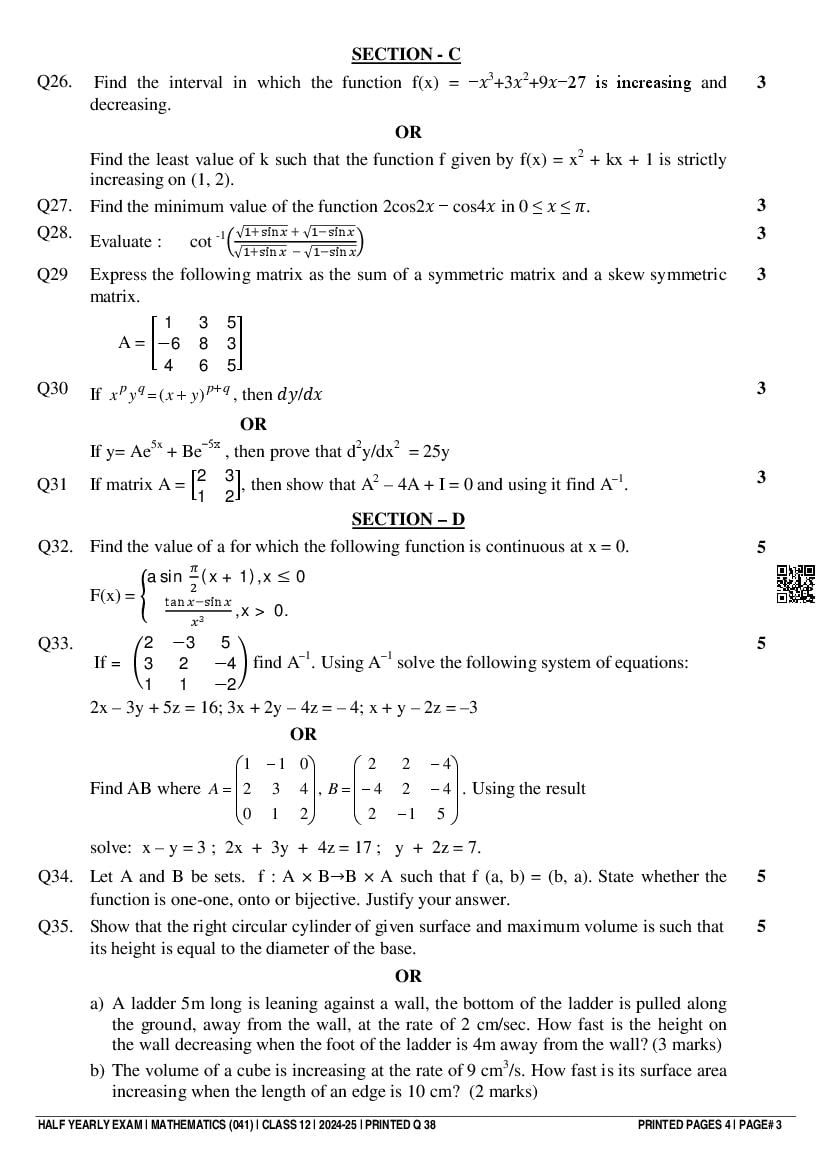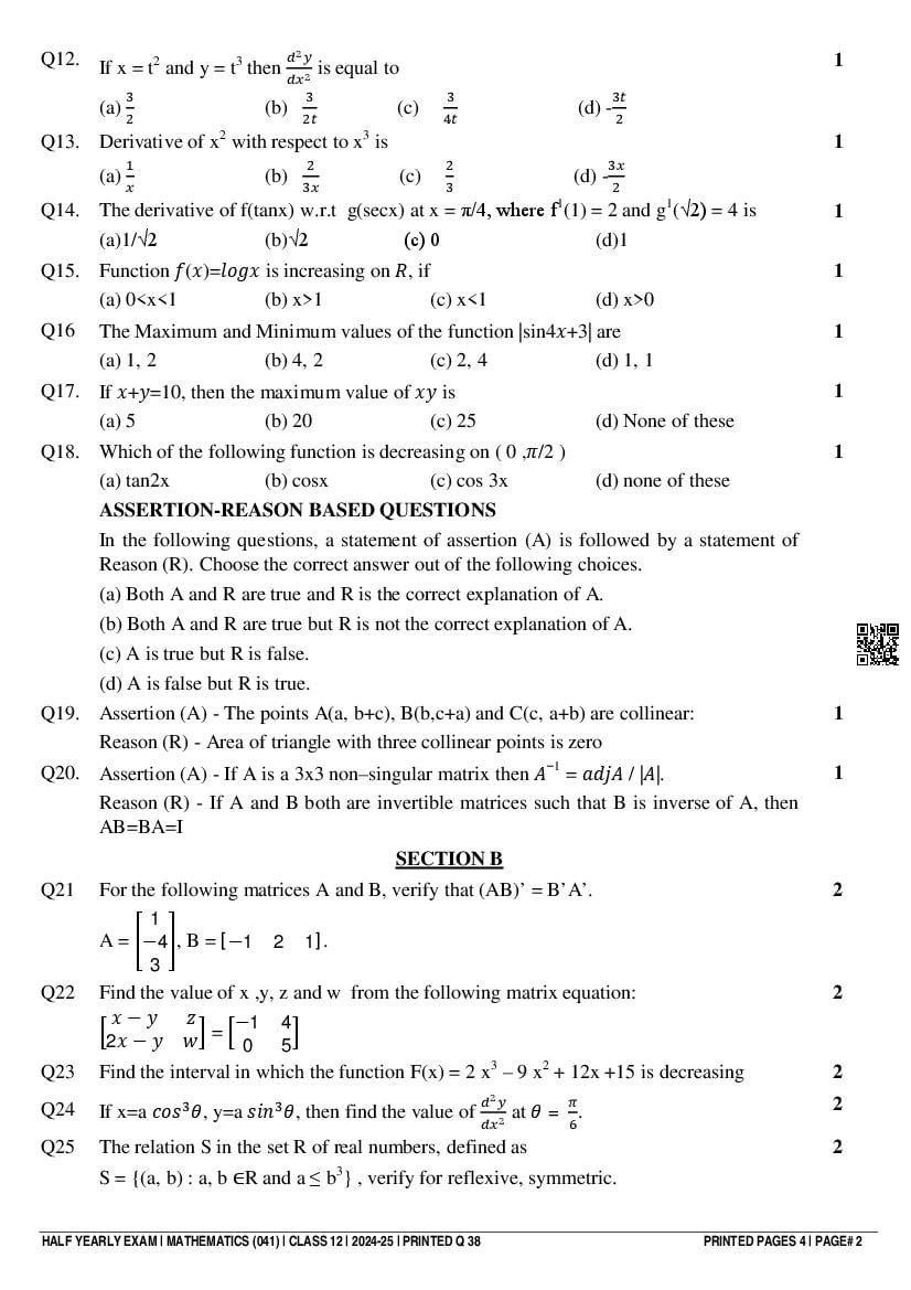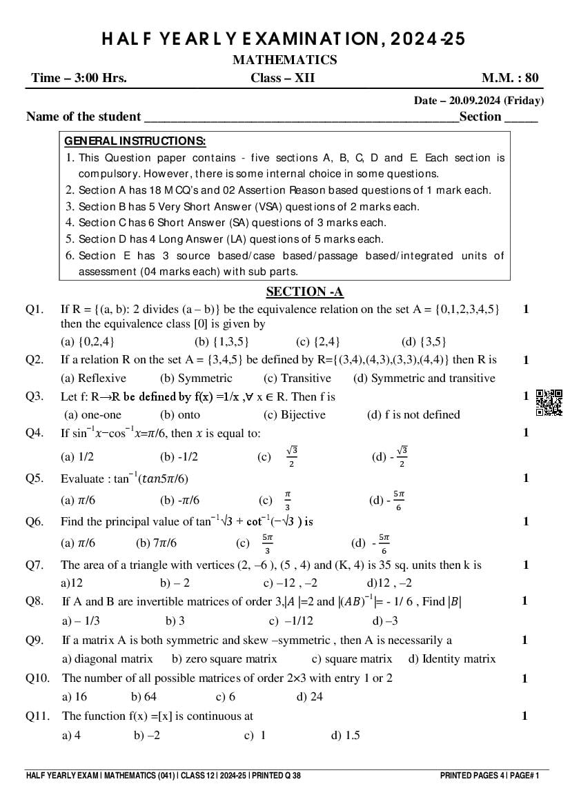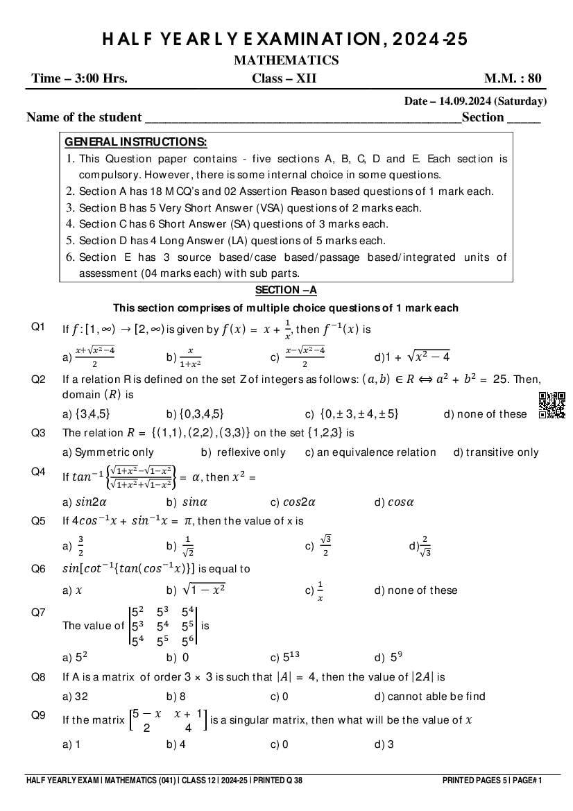 Class 12 Question Paper 2024-25 Maths (Half Yearly) View Download