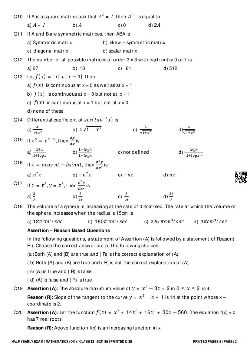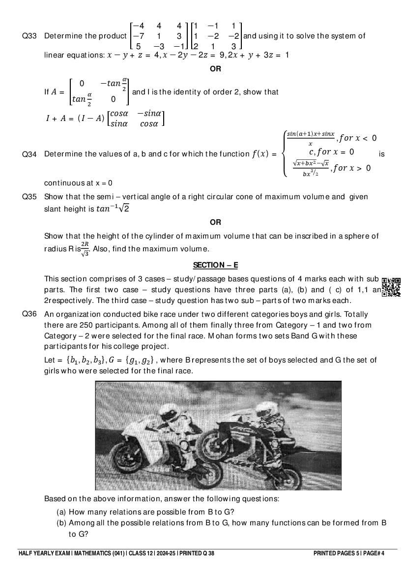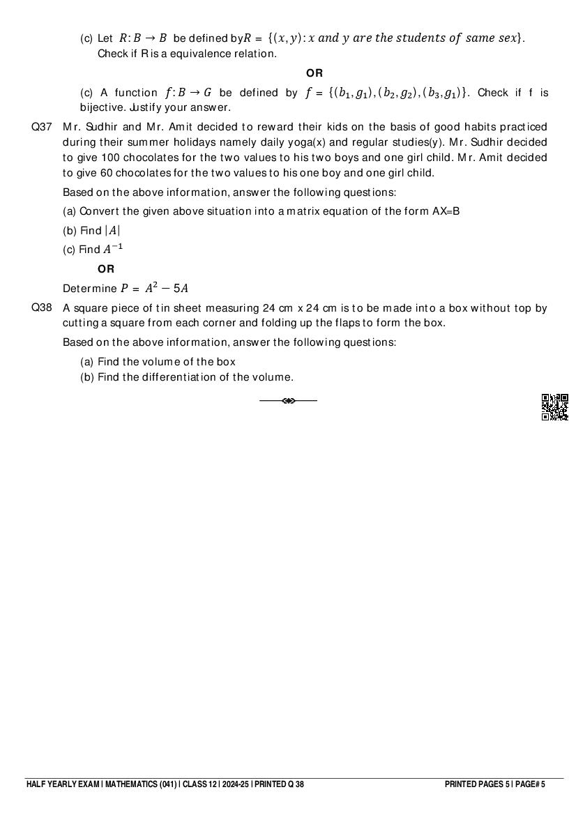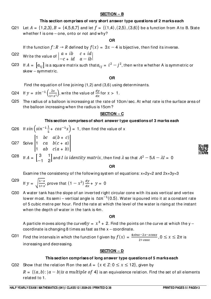 Class 12 Question Paper 2024-25 Maths (Half Yearly) View Download
